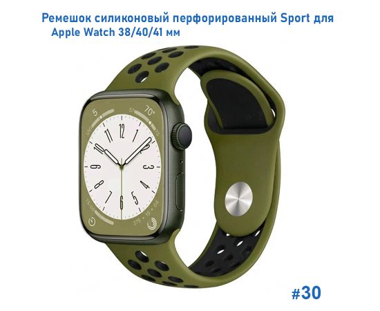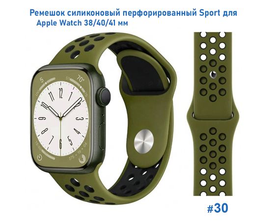 Ремешок силиконовый перфорированный Great Case Sport NK для Apple Watch 38/40/41 мм, 225мм, на кнопке, хаки+черный (30)