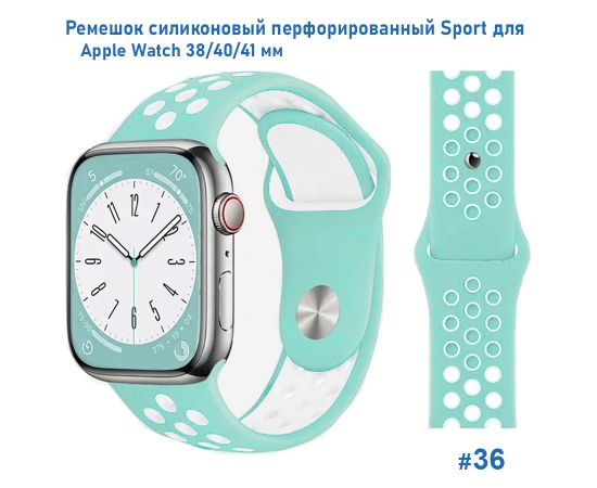 Ремешок силиконовый перфорированный Great Case Sport NK для Apple Watch 38/40/41 мм, 225мм, на кнопке, бледно-бирюзовый+белый (36)