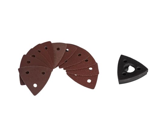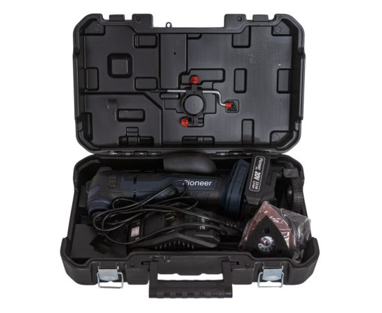 реноватор, режущая насадка по металлу, режущая насадка по дереву, дельта-видная шлифовальная пластина, наждачная бумага 12 шт., разъем для удаления пыли, угловой переходник, батарейный блок, быстрое зарядное устройство, кейс для хранения, руководство по эксплуатации