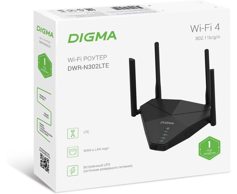 Роутер беспроводной Digma DWR-N302LTE N300 10/100BASE-TX/3G/4G cat. 4 черный