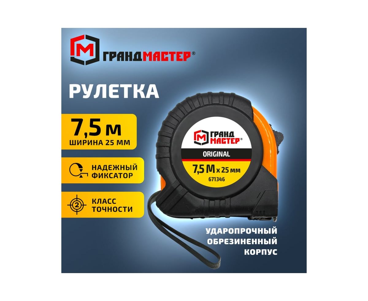 Рулетка измерительная ГРАНДМАСТЕР 671346 Original 7,5м*25мм, обрезиненный корпус, с фиксатором