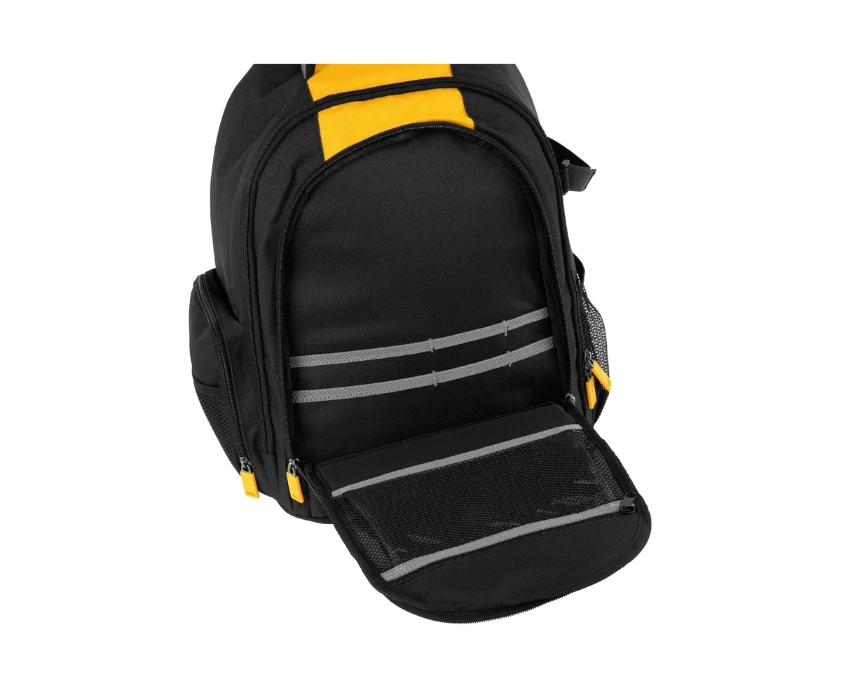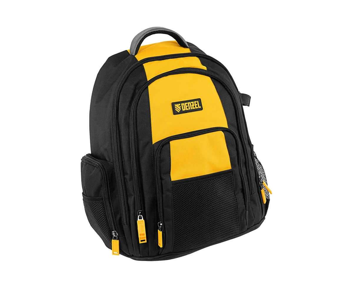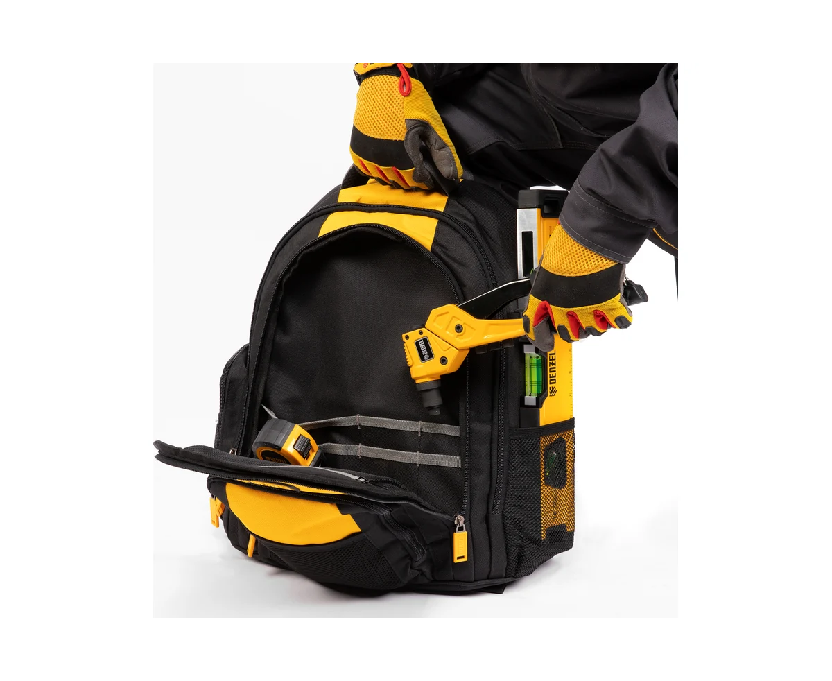 Рюкзак Denzel 90296 размером 365 х 190 х 430 мм, с 3 отделениями и 26 карманами (в том числе сетчатыми), предназначен для размещения и транспортировки ручного инструмента. 3 секции позволяют организовать упорядоченное хранение всех необходимых предметов. Рюкзак пригодится выездному мастеру.