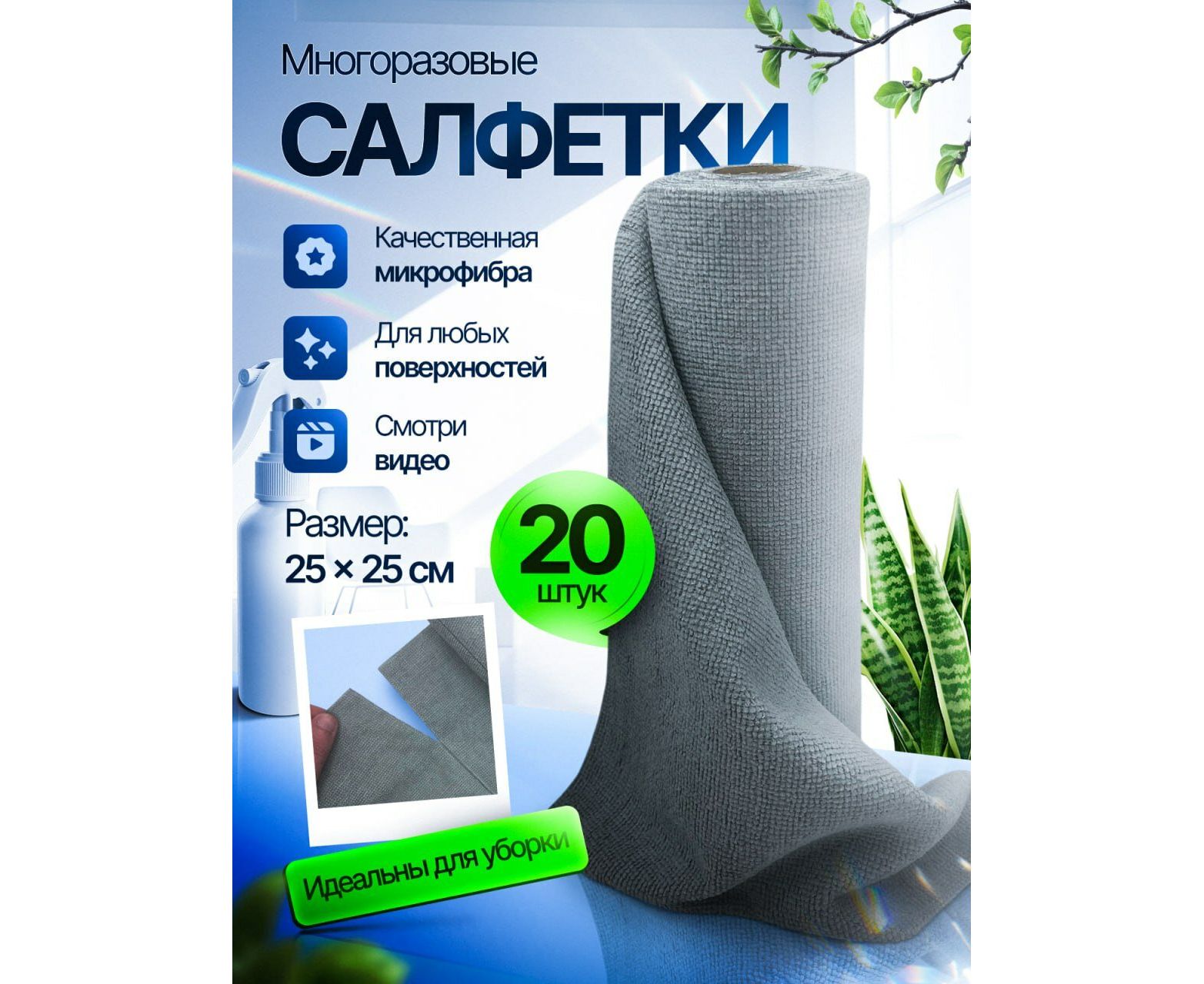 Салфетки для уборки в рулоне из микрофибры 25x25 см, Рулон 20 шт.