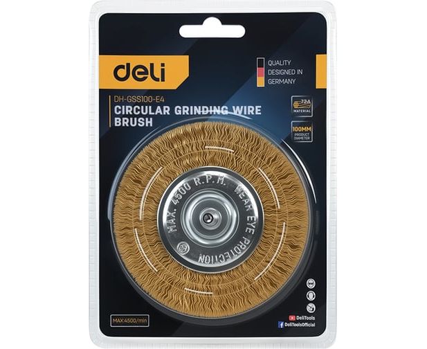 Щетка дисковая прямая для дрели Deli DH-GSS100-E4 100мм, латунированная, толщина проволоки 0,3мм, хвостовик 6мм, макс 4500об/мин