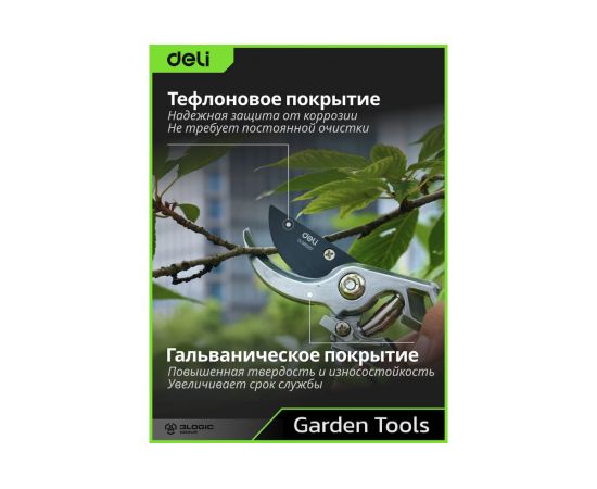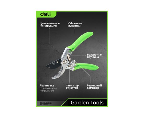 Секатор садовый Deli DL580207 цельнокованный, лезвия с тефлоновым покрытием, длина 215мм, макс. диаметр резки 12мм, сталь SK5