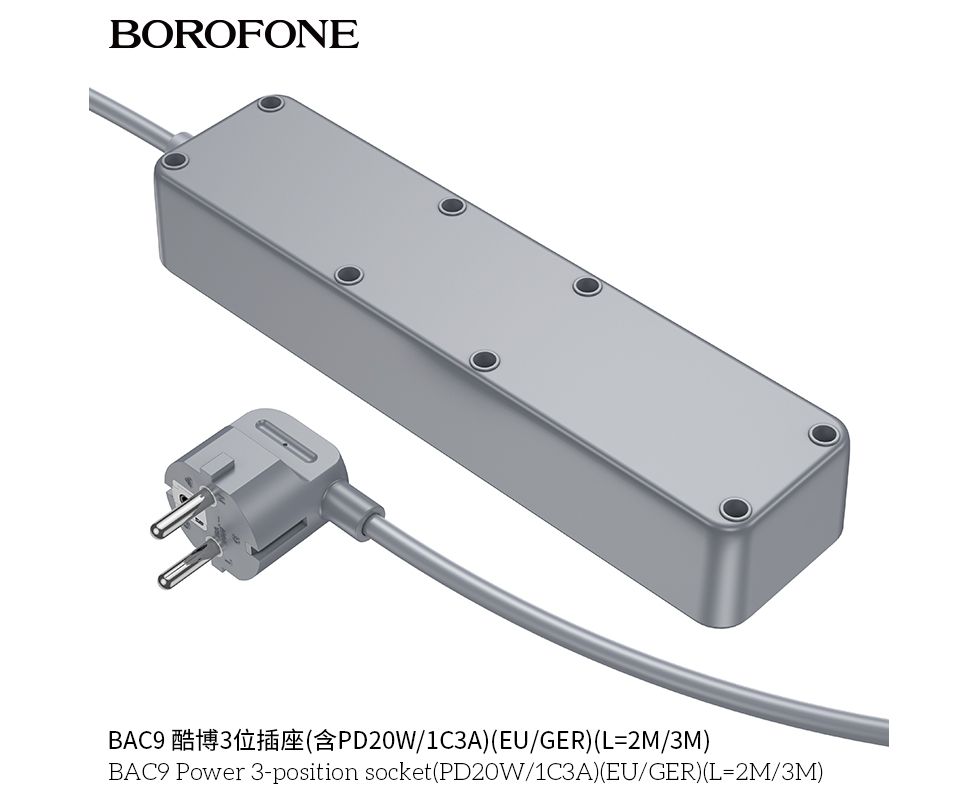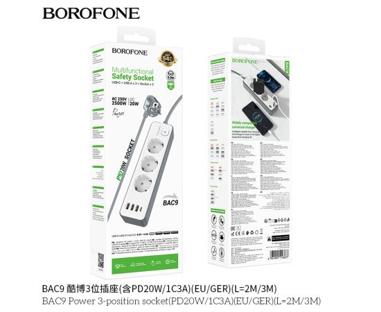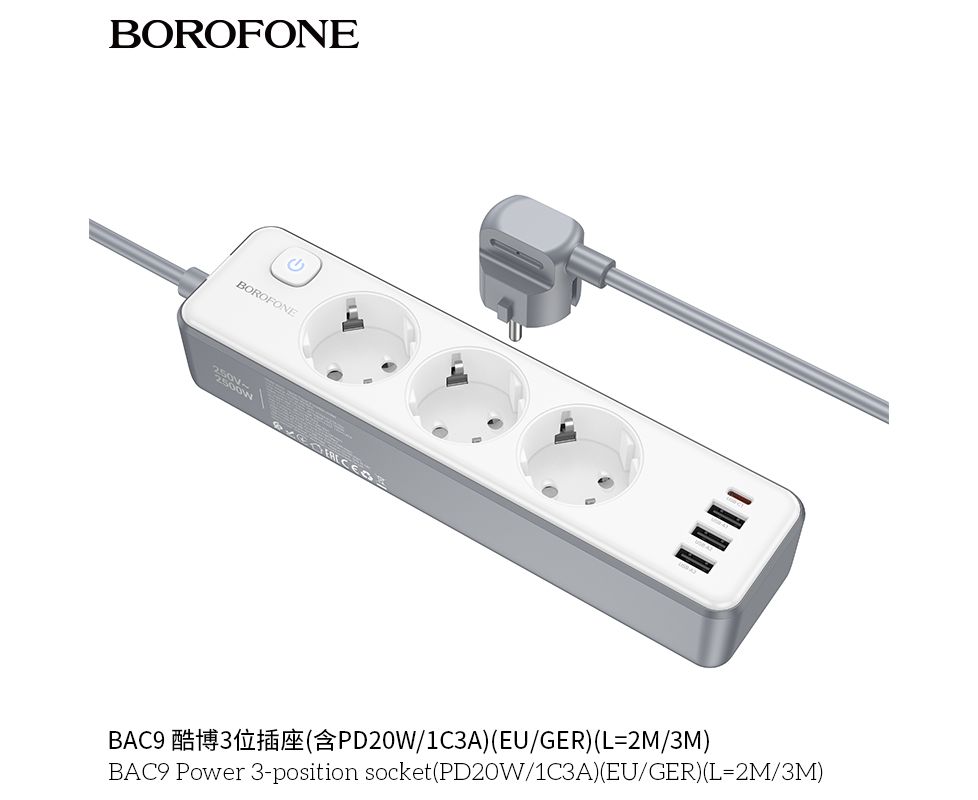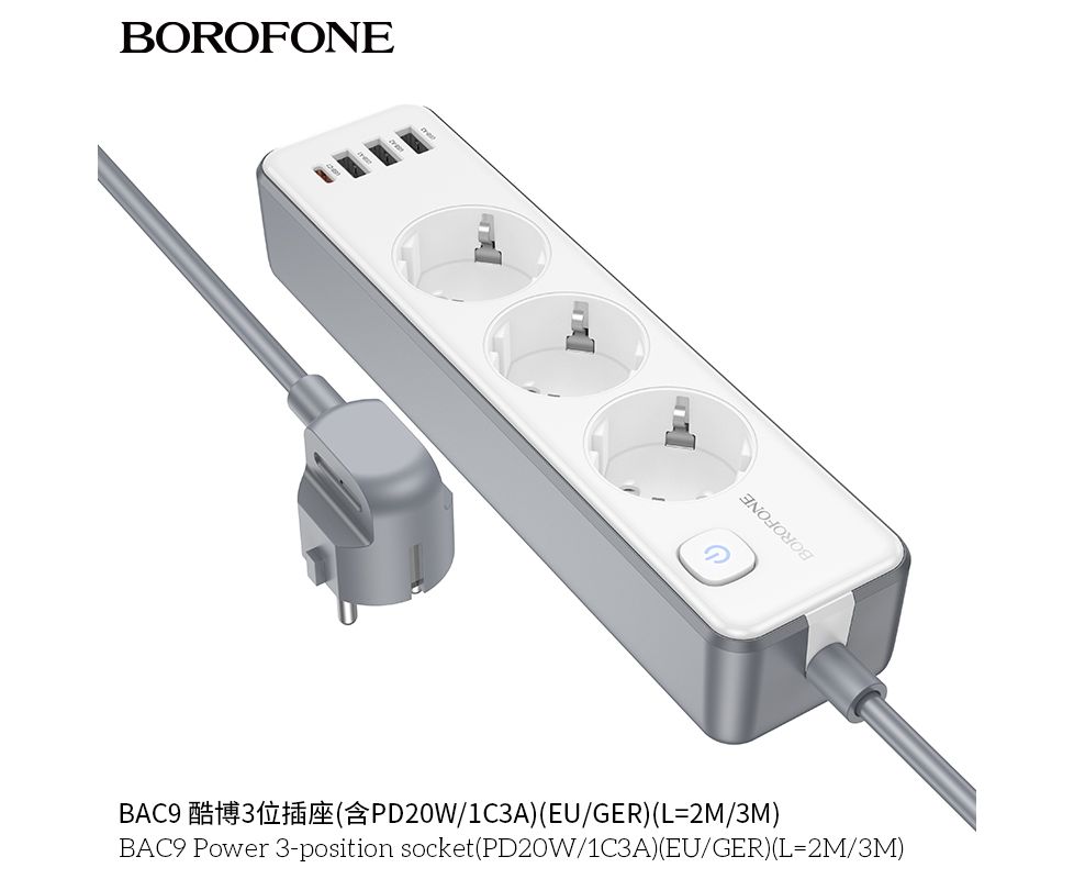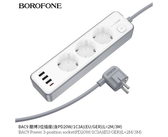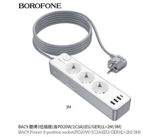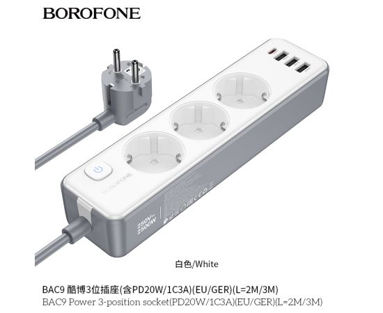 Сетевой фильтр BOROFONE BAC9 Power 3-position socket (PD20W/1C3A) (L=3M) (белый)
