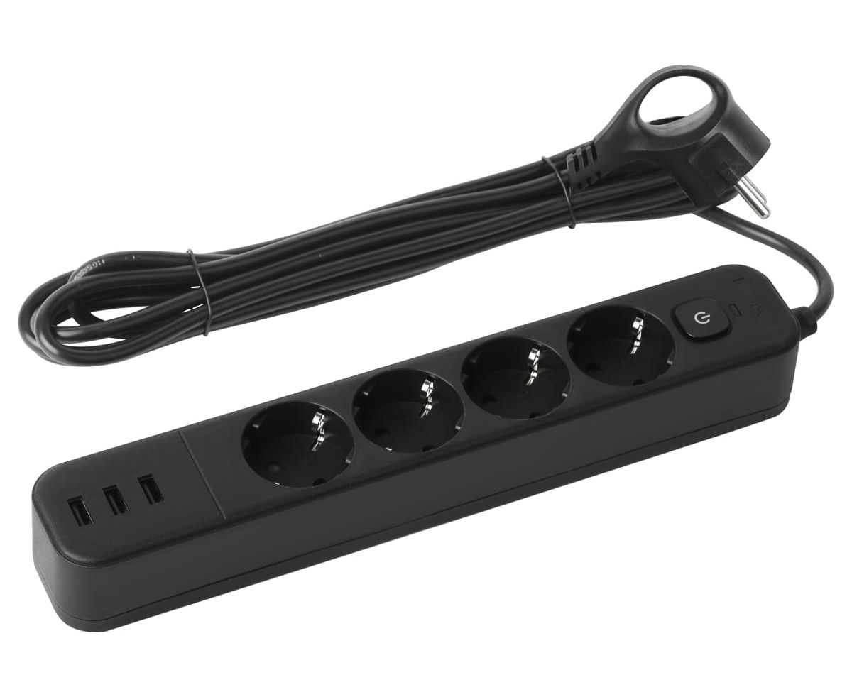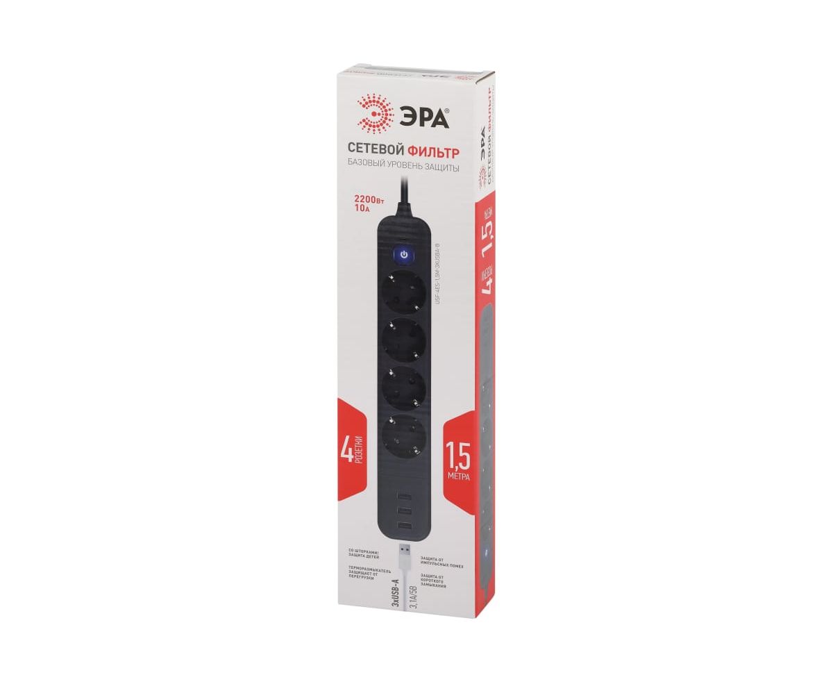 Сетевой фильтр ЭРА USF-4es-1,5m-3xUSBA-B, черный, с заземлением, с выключателем, 4 розетки, 3 USB, провод 1,5 м, ПВС 3x0,75мм2. Базовый уровень защиты техники: от импульсных помех, от перегрузки, от короткого замыкания. Максимальная мощность 10А/2200 Вт. Корпус из негорючего пластика (полипропилен). Вилка обеспечена кольцом для удобного извлечения ее из розетки. Выключатель со световой индикацией позволяет выключить все приборы, подключенные к сетевому фильтру, не вынимая вилки из розетки. Отлично подойдет для защиты бытовой и компьютерной техники. Сетевой фильтр оснащен 3 USB A (3,1А) для зарядки мобильных устройств.