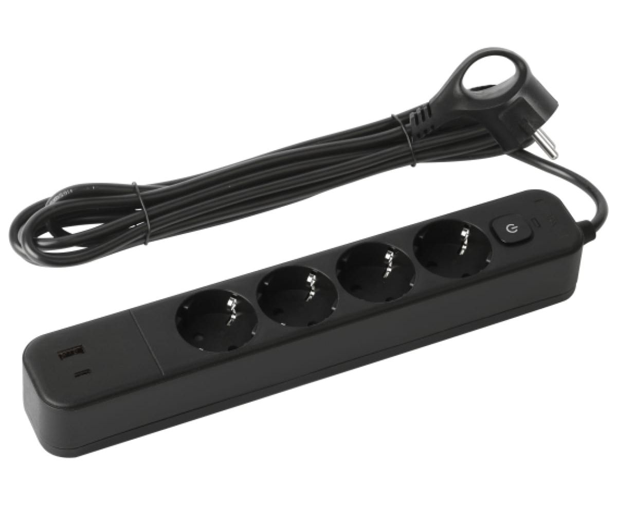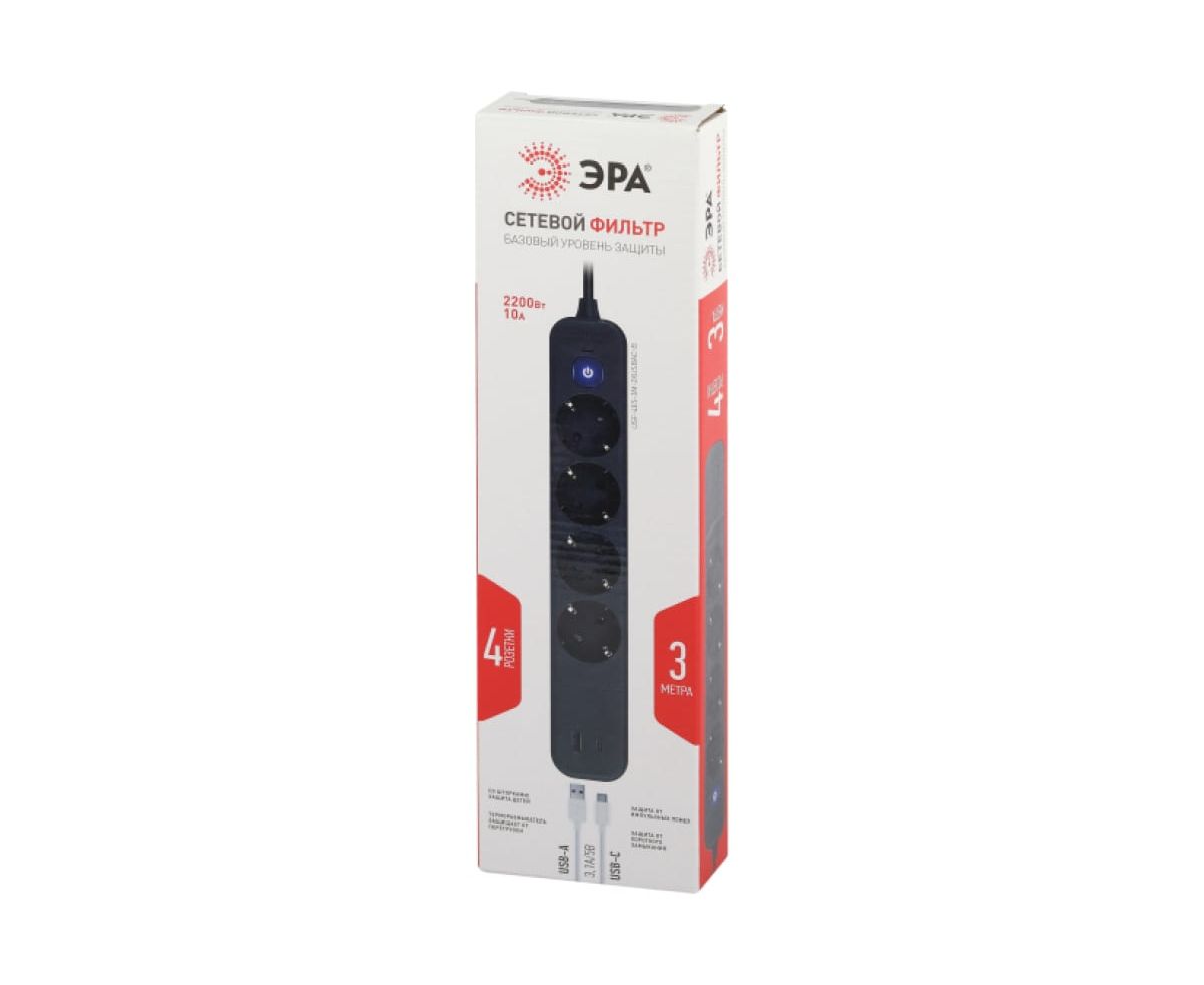 Сетевой фильтр ЭРА USF-4es-3m-2xUSBAC-B, черный, с заземлением, с выключателем, 4 розетки, 2 USB, провод 3м, ПВС 3x0,75мм2. Базовый уровень защиты техники: от импульсных помех, от перегрузки, от короткого замыкания. Максимальная мощность 10А/2200 Вт. Корпус из негорючего пластика (полипропилен). Вилка обеспечена кольцом для удобного извлечения ее из розетки. Выключатель со световой индикацией позволяет выключить все приборы, подключенные к сетевому фильтру, не вынимая вилки из розетки. Отлично подойдет для защиты бытовой и компьютерной техники. Сетевой фильтр оснащен 2 USB Type C+A (2,4А) для зарядки мобильных устройств.