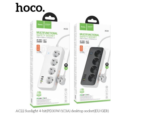 Сетевой фильтр HOCO AC22 Sunlight 4-bit (PD30W/1C3A) (L=1.5M) (белый)