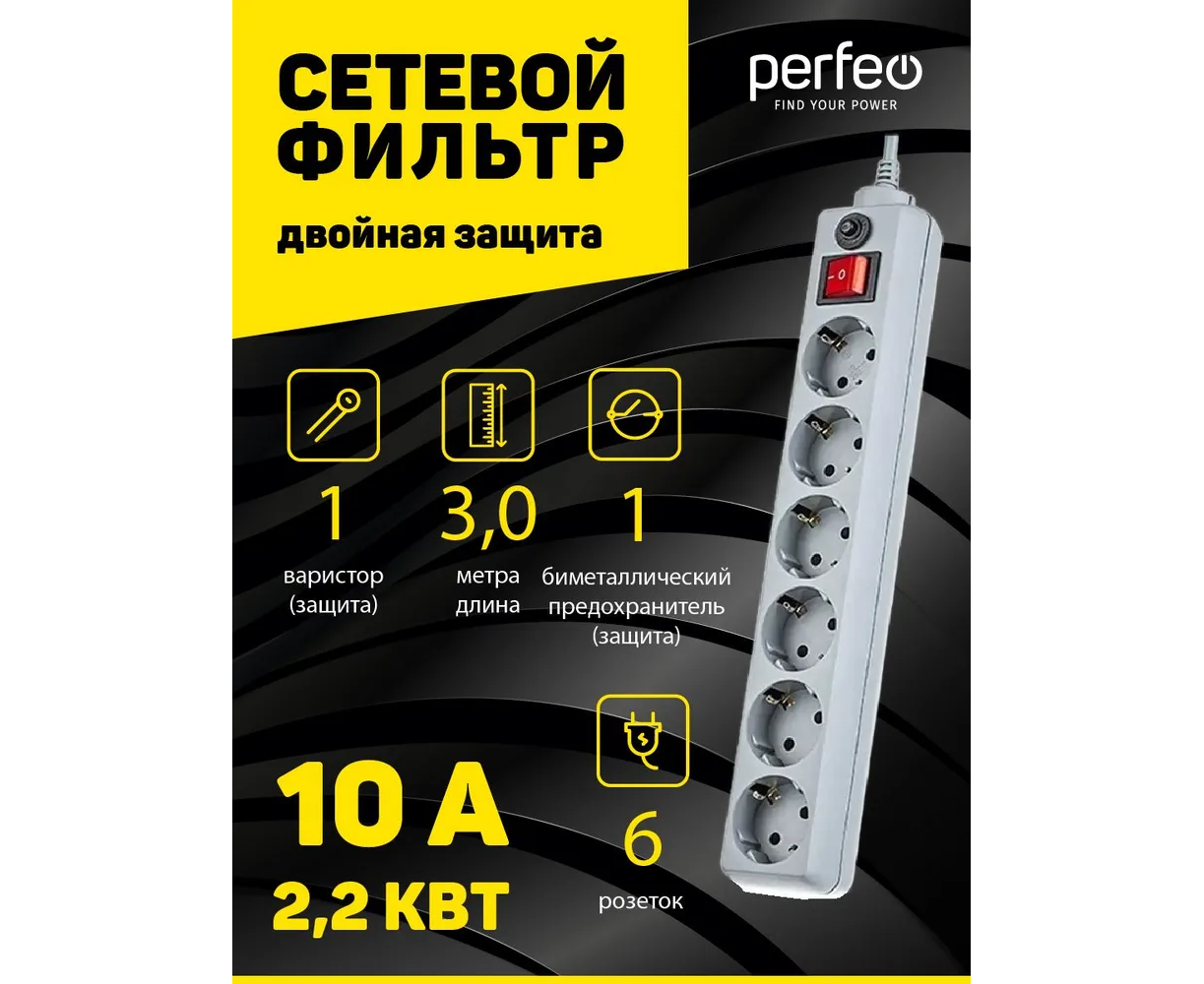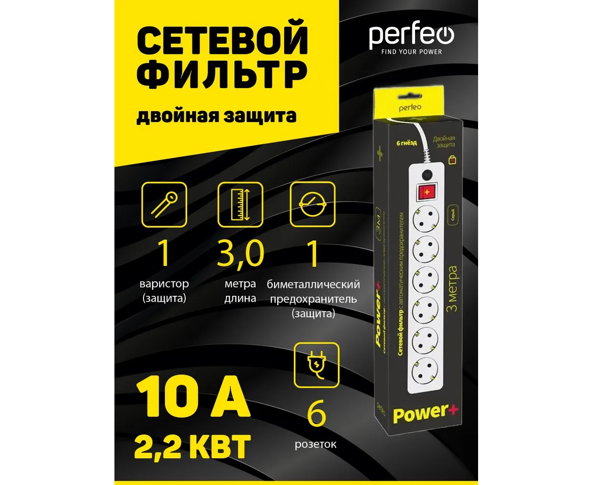 Сетевые фильтры серии "POWER+" оснащены двойной системой защиты.Помимо варисторной защиты которая служит для защиты вашей техники от высоковольтных разрядов (молний и индустриальных помех), специалисты компании Perfeo снабдили сетевые фильтры автоматическим предохранителем для отключения при перегрузках и коротких замыканиях. Благодаря этим системам защиты Вы можете быть спокойны за электроприборы в Вашем доме.Так же сетевые фильтры серии "POWER+" имеют и другие достоинства: Удобная кнопка включения. Корпус из ударопрочного негорючего материала. Долговечный, гибкий провод. Качественный материал контактов розеток (латунь). Технические параметры: Ток помехи, выдерживаемый ограничителем 4500 А. Рабочая частота 50/60 Гц. Входное напряжение 220-230В. Ток срабатывания защиты 10 А при 220 В. Суммарная мощность нагрузки 2.3 кВт. Максимальная поглощаемая энергия 90 Дж. Входная вилка EUROДлина кабеля от 1,8 метра до 5 метров.