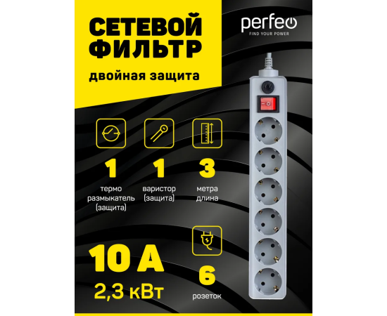 Сетевой фильтр Perfeo "POWER+", 3,0м, 6 розеток, (PF-PP-6/3,0-G), серый