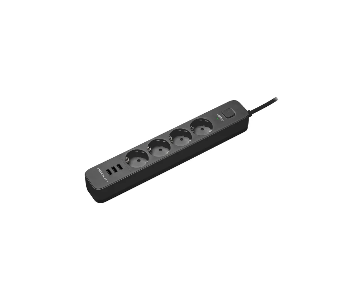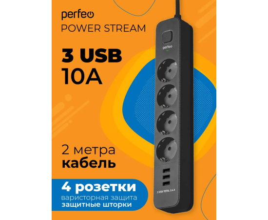 Сетевой фильтр Perfeo "POWER STREAM", 2500W, 2,0м, 4 розетки, 3 USB, черный.