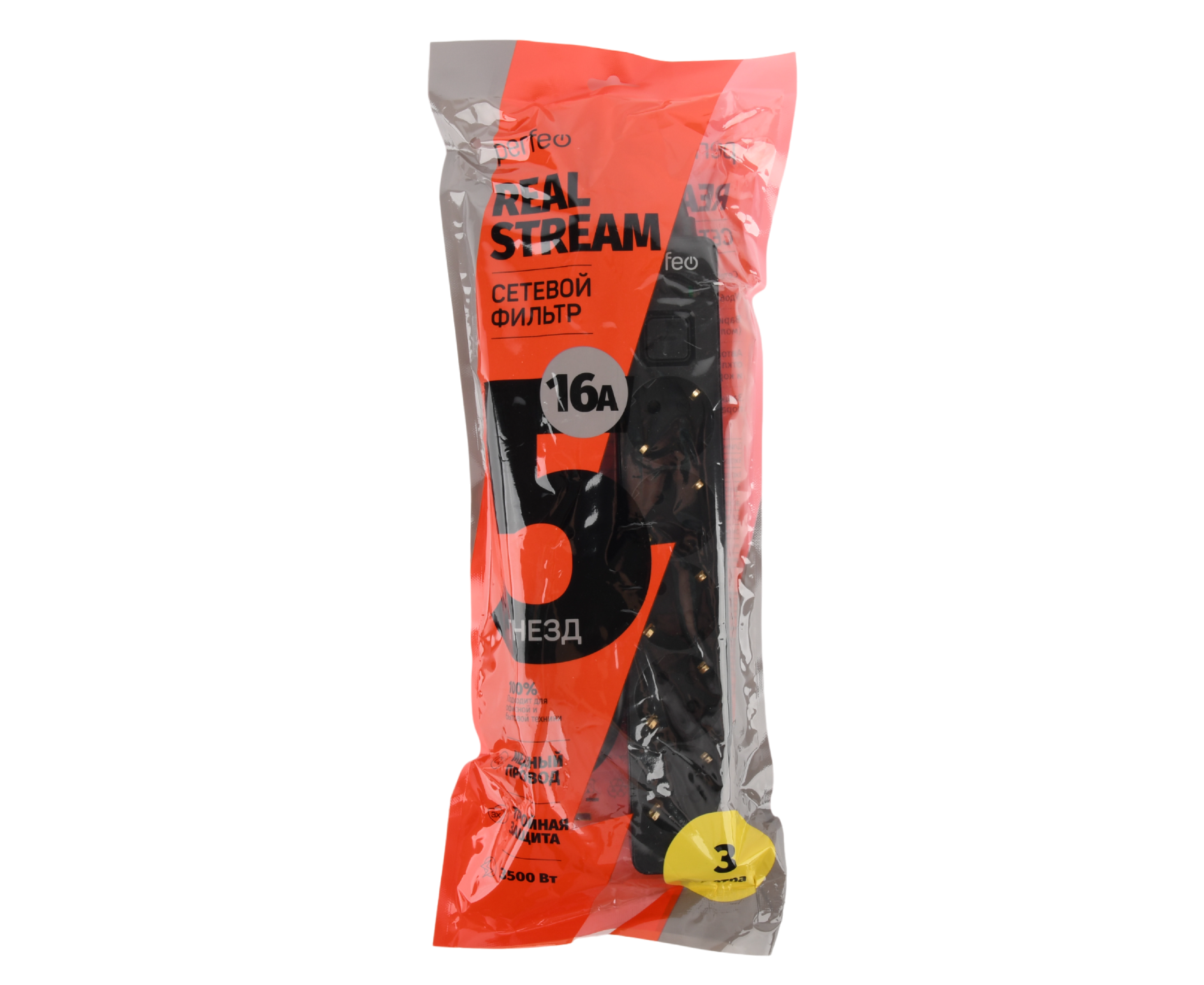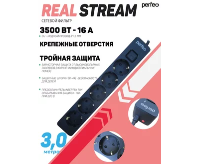 Сетевой фильтр Perfeo "REAL STREAM, 3,0м, 5 розеток, 16А, 3500 Вт, тройная защита, черный.