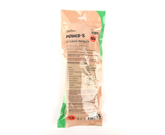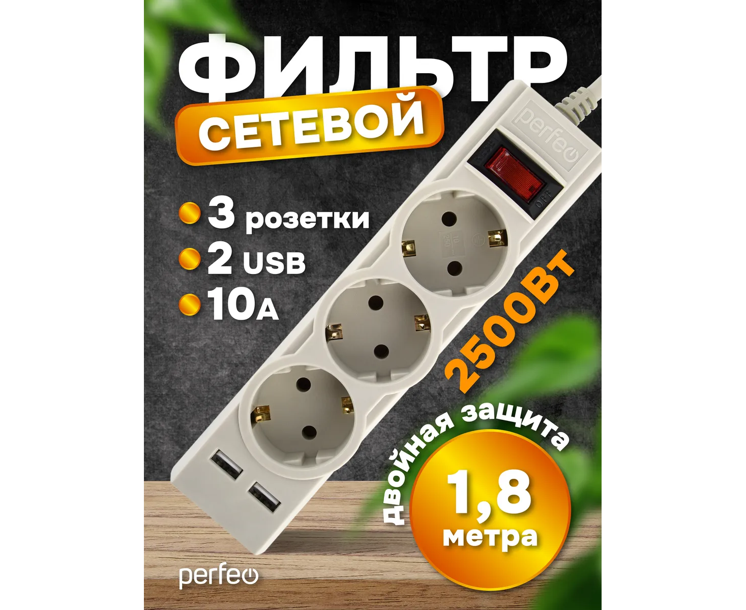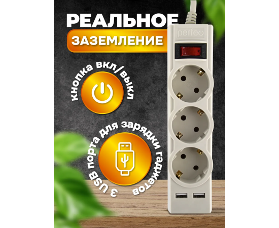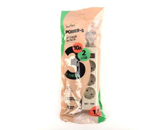Сетевой фильтр Perfeo "POWER-S", 1,8м, 3 розетки 10А, 2USB, 2500 Вт, двойная защита, белый