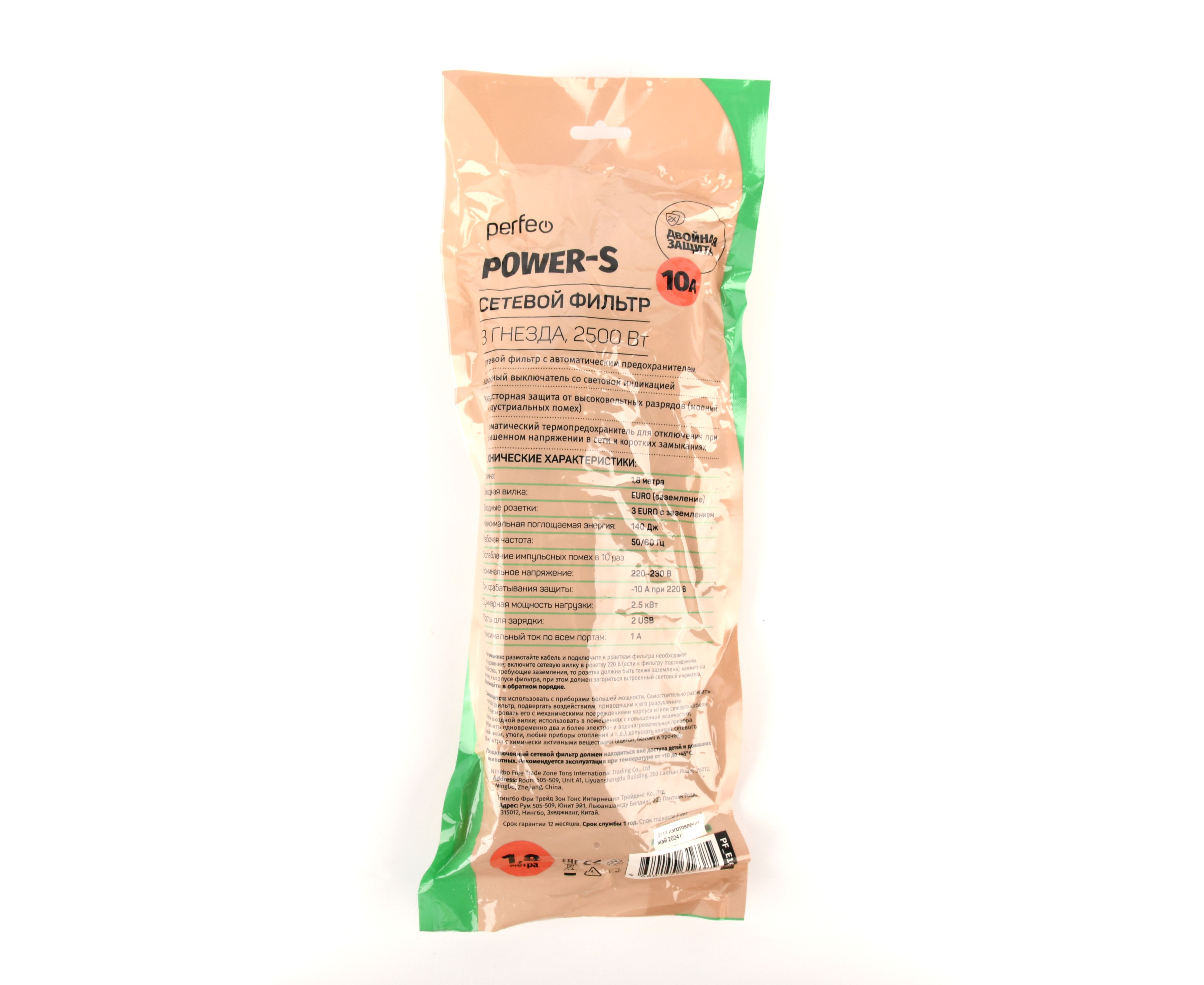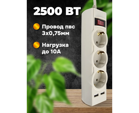 Сетевой фильтр с заземлением, со встроенной защитой от импульсных помех, короткого замыкания или перегревания. Отличный выбор для компьютера, аксессуар для пк и другой бытовой техники. Пилот, тройник, удлинитель оснащен двумя портами USB-A. Компактный корпус, кнопка включения/отключения питания удобный в использовании. Удлинитель предоставляет высокий уровень безопасности. Подойдет для EURO вилок. Фильтр выполнен из негорючего пластика до 850С. Можете одновременно заряжать 2 устройства, максимальный выходной ток на USB порте 1А. Прекрасная альтернатива зарядки для гаджетов. Нужный аксессуар для офиса и дома. Ток: 10А. Мощность сетевого фильтра - 2500 Вт. Незаменимый аксессуар для ноутбука, компьютера. Защищает от высокочастотных импульсов в сети, скачков напряжения. Максимальная поглощаемая энергия: 140Дж.