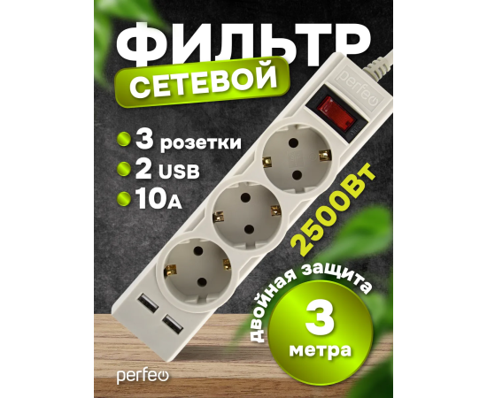 Сетевой фильтр Perfeo "POWER-S", 3,0м, 3 розетки 10А, 2USB, 2500 Вт, двойная защита, белый
