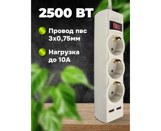 Сетевой фильтр с заземлением, со встроенной защитой от импульсных помех, короткого замыкания или перегревания. Отличный выбор для компьютера, аксессуар для пк и другой бытовой техники. Пилот, тройник, удлинитель оснащен двумя портами USB-A. Компактный корпус, кнопка включения/отключения питания удобный в использовании. Удлинитель предоставляет высокий уровень безопасности. Подойдет для EURO вилок. Фильтр выполнен из негорючего пластика до 850С. Можете одновременно заряжать 2 устройства, максимальный выходной ток на USB порте 1А. Прекрасная альтернатива зарядки для гаджетов. Нужный аксессуар для офиса и дома. Ток: 10А. Мощность сетевого фильтра - 2500 Вт. Незаменимый аксессуар для ноутбука, компьютера. Защищает от высокочастотных импульсов в сети, скачков напряжения. Максимальная поглощаемая энергия: 140Дж.
