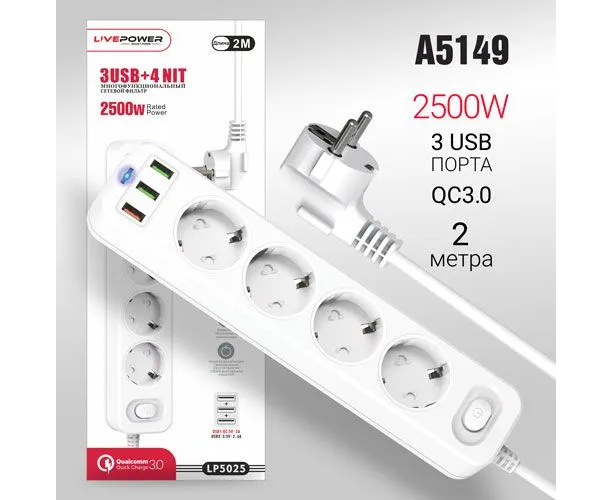 Сетевой фильтр-удлинитель Live-Power LP5025 3USB+QC3.0 + 4 розетки 2000mm White