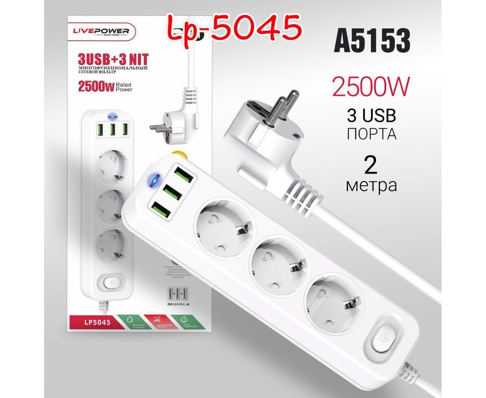 Сетевой фильтр-удлинитель Live-Power LP5045 3USB + 3 розетки 2000mm White