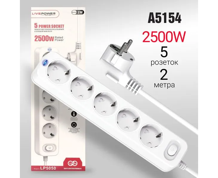 Сетевой фильтр-удлинитель Live-Power LP5050 5 розеток 2000mm White