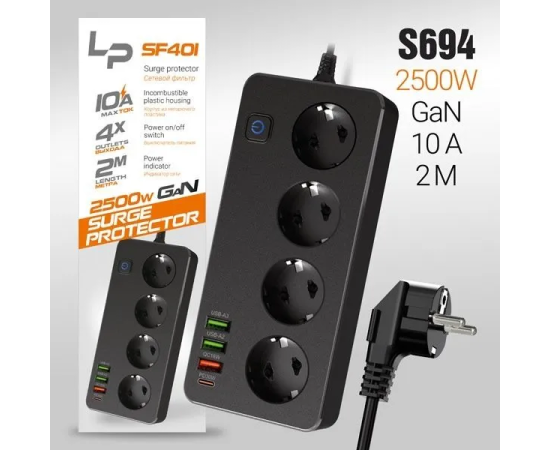 Сетевой фильтр-удлинитель LP SF401 4розетки 3USB A+C Gan 45W/10А 2500W 2м black