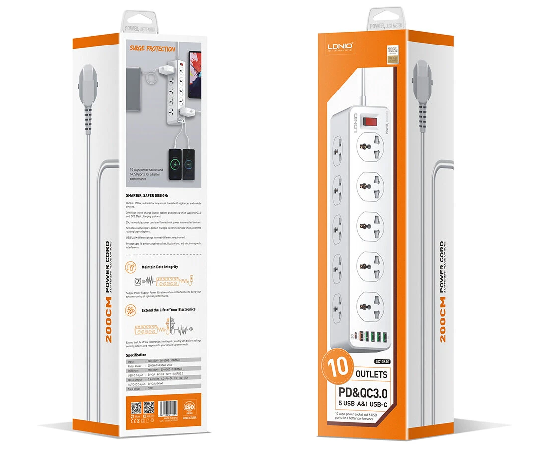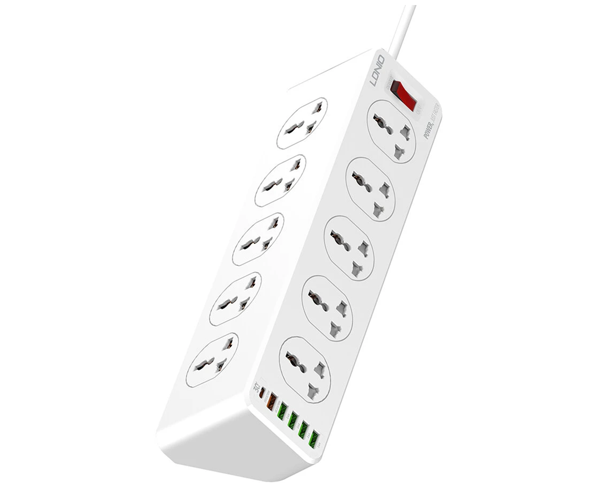 Сетевой удлинитель LDNIO SC10610 (LD_D0426) 2м 10 розеток EU UK US 2500W 6USB QC 3.0+PD 3.0 30W White