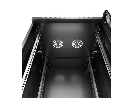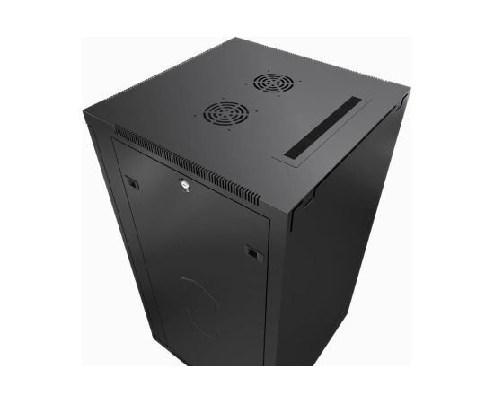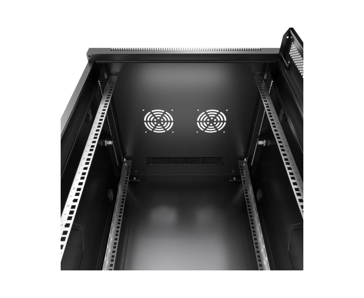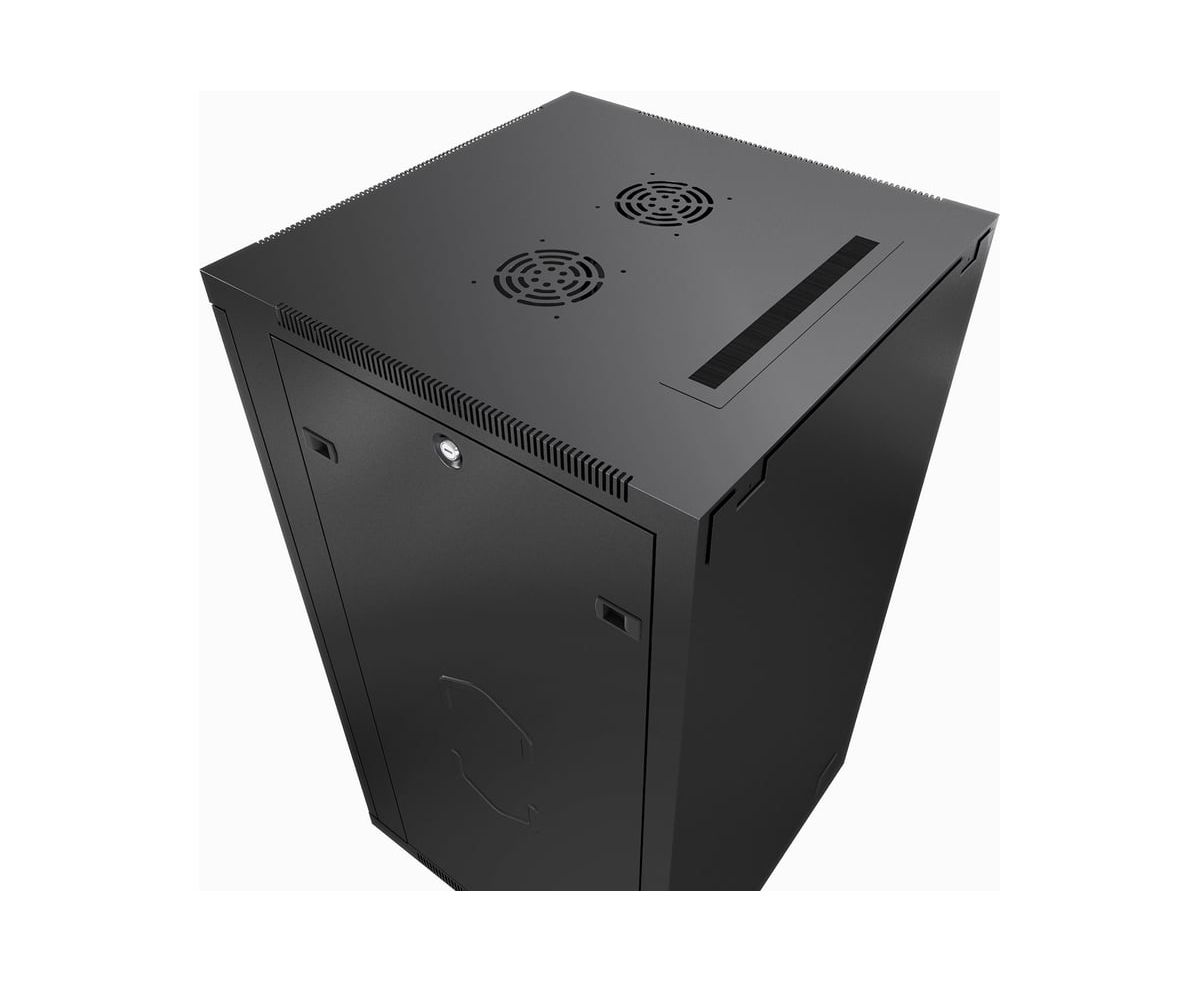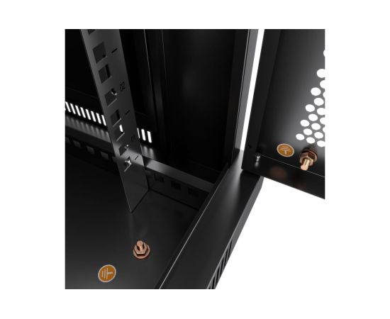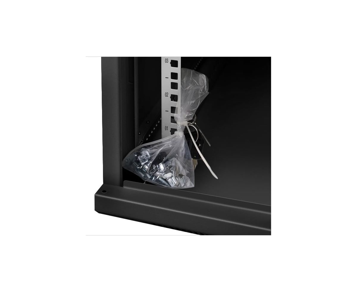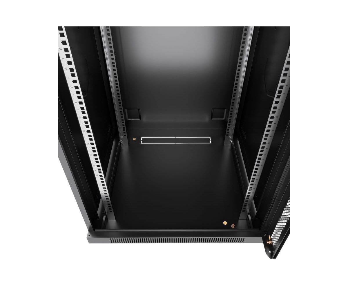 Передняя дверь комплектуется поворотной ручкой с замком. Крыша шкафа имеет перфорацию. Крыша и основание шкафа имеют отверстия для ввода кабеля. Вертикальные направляющие регулируются по глубине. Боковые стенки съемные. Шкаф поставляется в разобранном виде в двух упаковках.