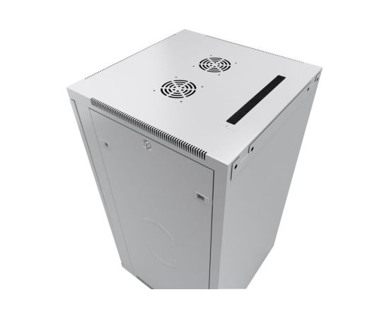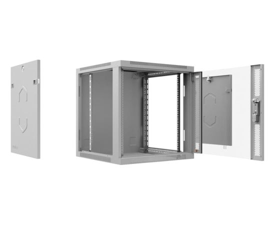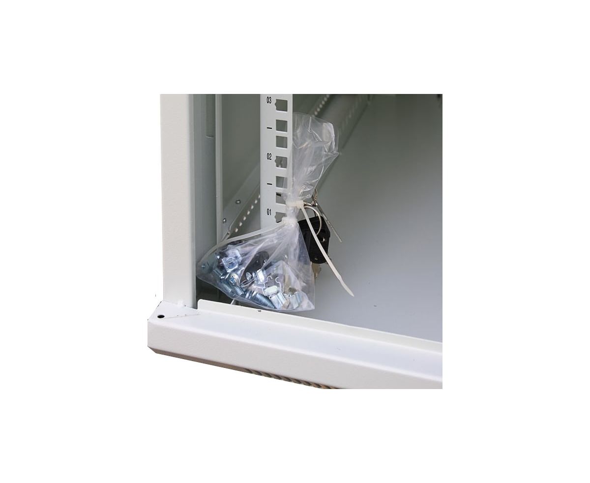 Передняя дверь комплектуется поворотной ручкой с замком. Крыша шкафа имеет перфорацию. Крыша и основание шкафа имеют отверстия для ввода кабеля. Вертикальные направляющие регулируются по глубине. Боковые стенки съемные.