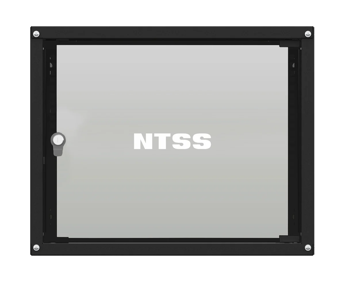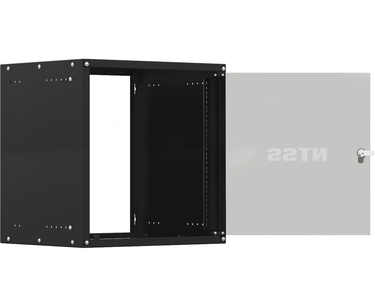 Компактный разобранный настенный шкаф NTSS серии «W» с передней дверью, открываемыми боковыми стенками на защелках, задней стенкой и панелями пола и потолка.