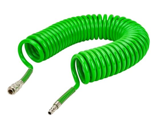 Шланг полиуретановый спиральный с быстросъемами 8/12 мм, 10 м ECO AHU-1080 оснащен быстросъемными соединителями и применяется для соединения пневматического инструмента с компрессорами и линиями подачи сжатого воздуха. Благодаря спиральной форме шланг способен растягиваться и сжиматься по принципу пружины, что предотвращает его запутывание и переламывание.