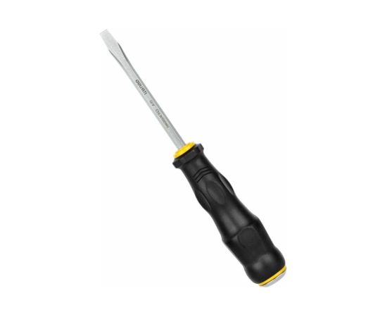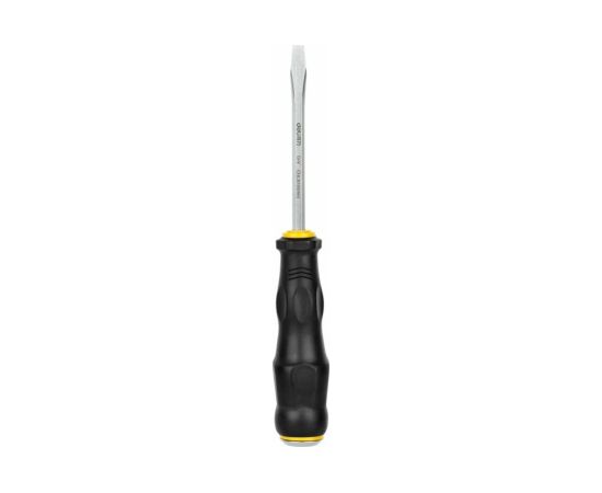 Ударная шлицевая отвертка используется для работ с резьбовыми соединениями в процессе ремонта или монтажа. Металлический затыльник рукоятки позволяет использовать инструмент вместе с молотком в процессе откручивания сложных винтов и гаек. Стержень выполнен из качественной хромованадиевой стали, что обеспечивает высокую антикоррозийную стойкость и долговечность.
