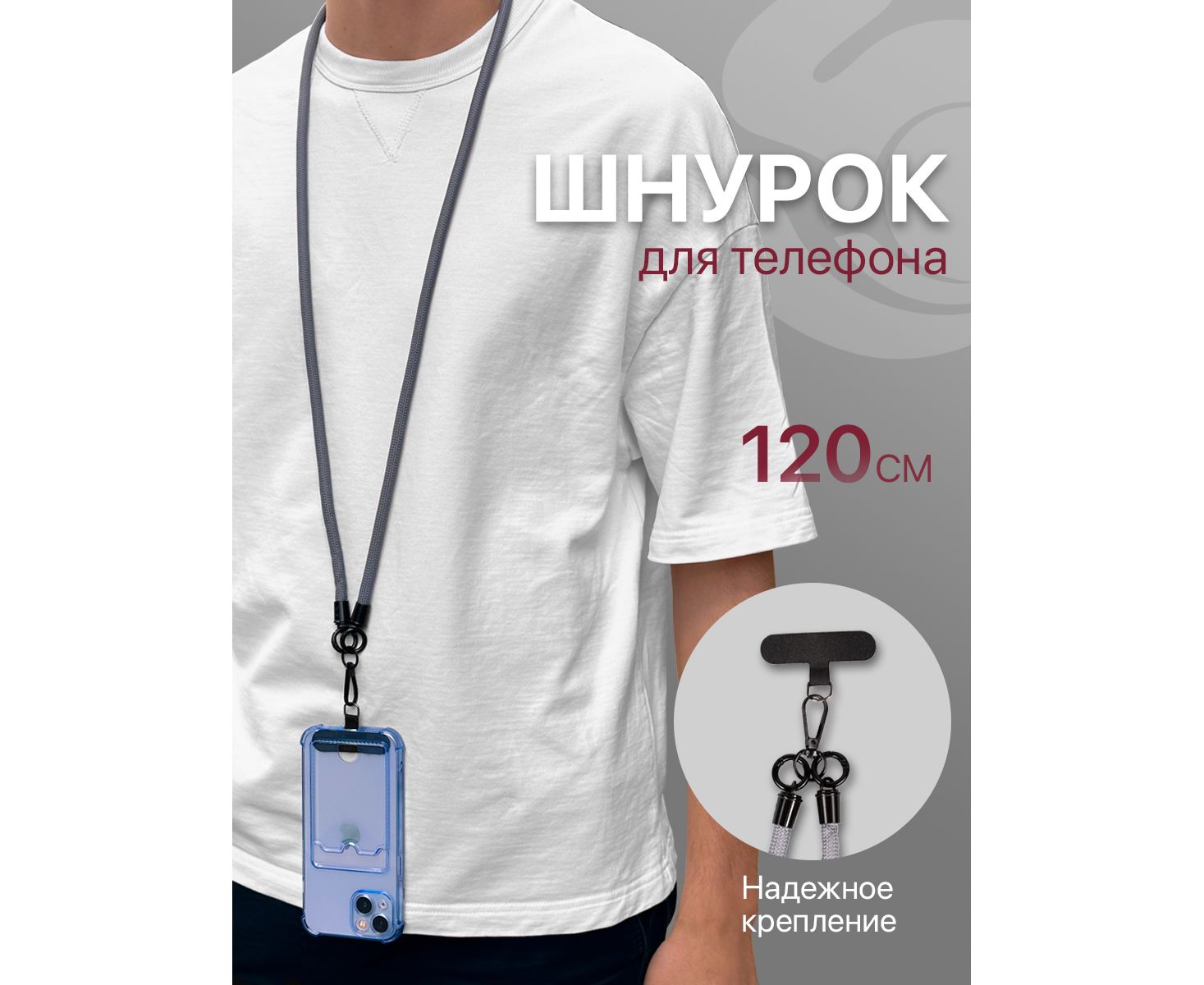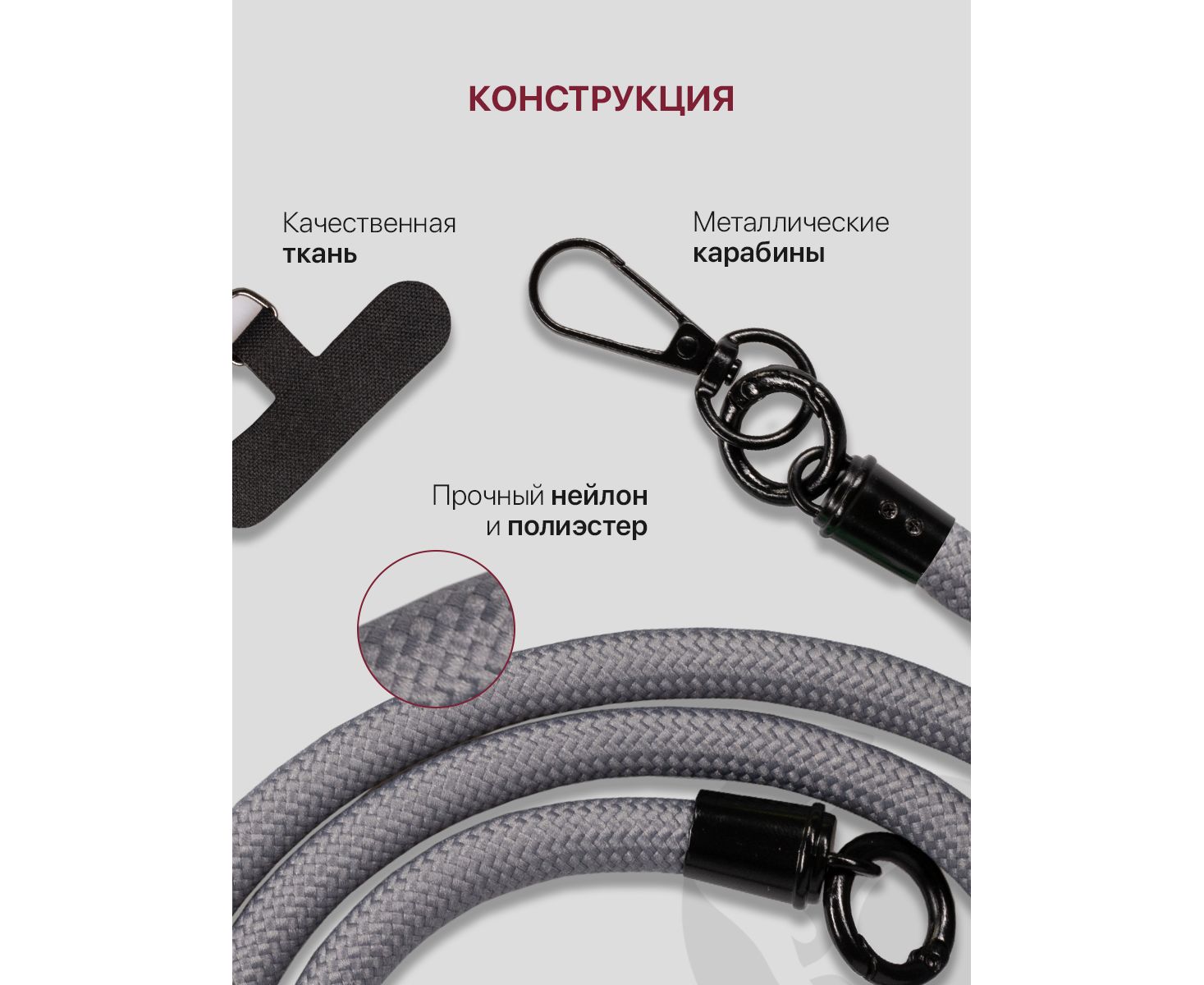 Шнурок универсальный 120см: для телефона на шею, для ключей, бейджа, пропуска, ремешок веревка через плечо, на руку, с карабином нейлоновый регулируемый, серый
