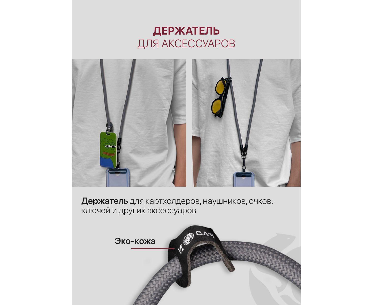 - Петля для аксессуаров и два дополнительных кольца-карабина. Вы можете легко и надежно закрепить на шнурке сразу несколько предметов, чтобы всегда иметь их под рукой.