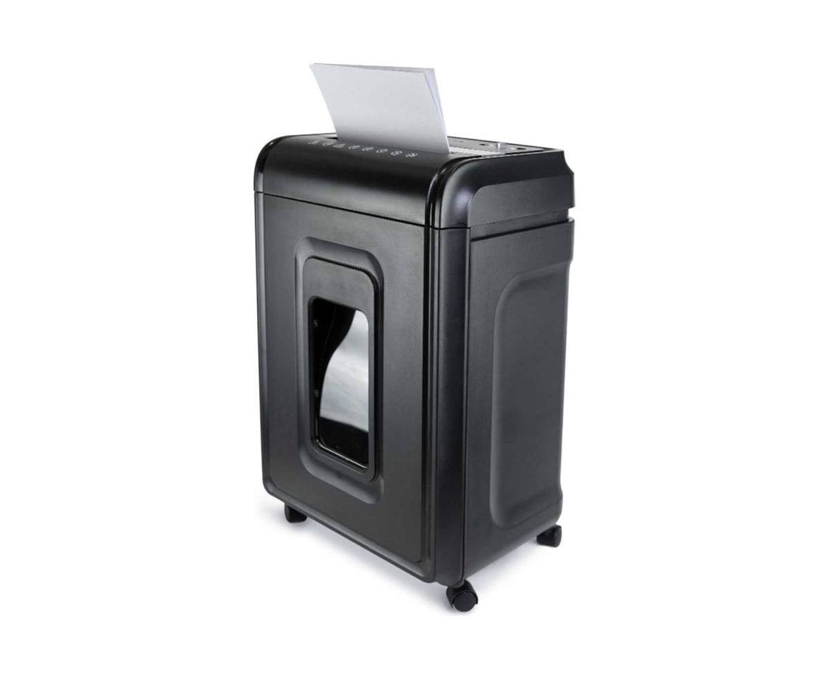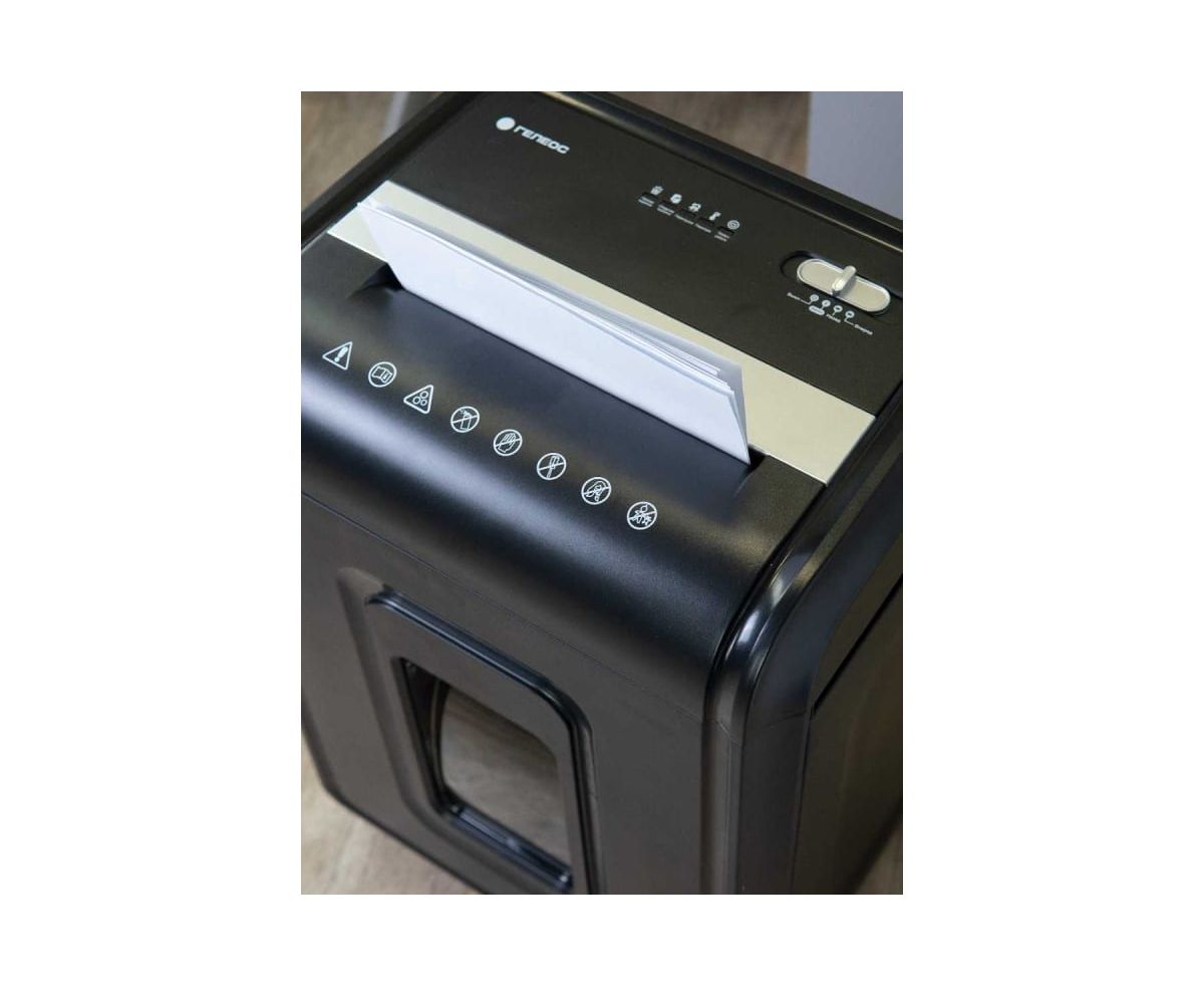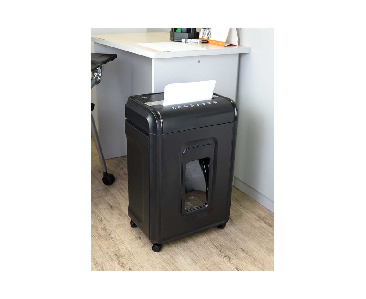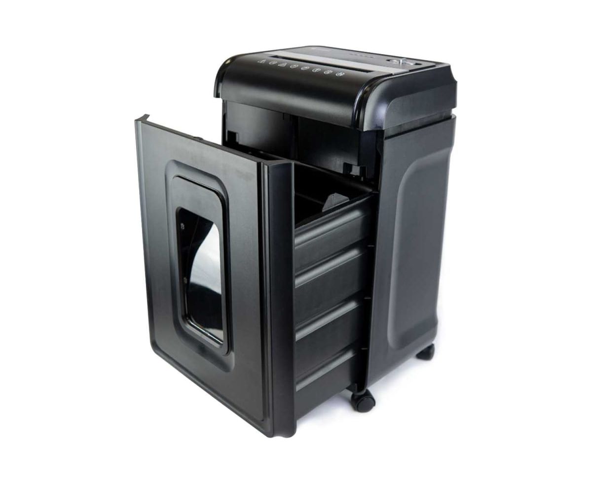 Устройство оснащено выдвижной корзиной с емкостью 32 литра, что позволяет вместить до 600 листов уничтоженных материалов. Габариты шредера составляют 385 х 280 х 593 мм, а также имеются колеса для легкого перемещения устройства из одного места в другое.