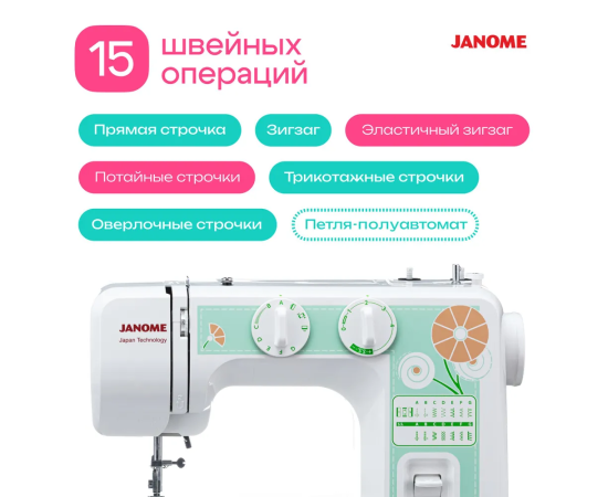15 швейных операций: прямая строчка (центральное и левое положение иглы), зигзаг, эластичный зигзаг, потайные строчки, трикотажная строчка, трикотажный зигзаг, строчка мережка, оверлочные строчки, петля-полуавтомат