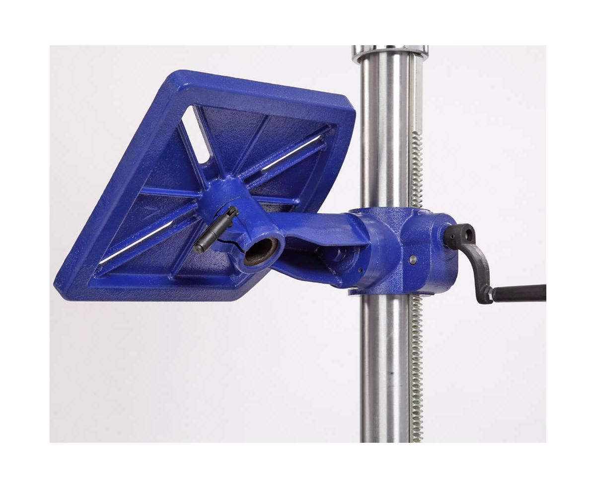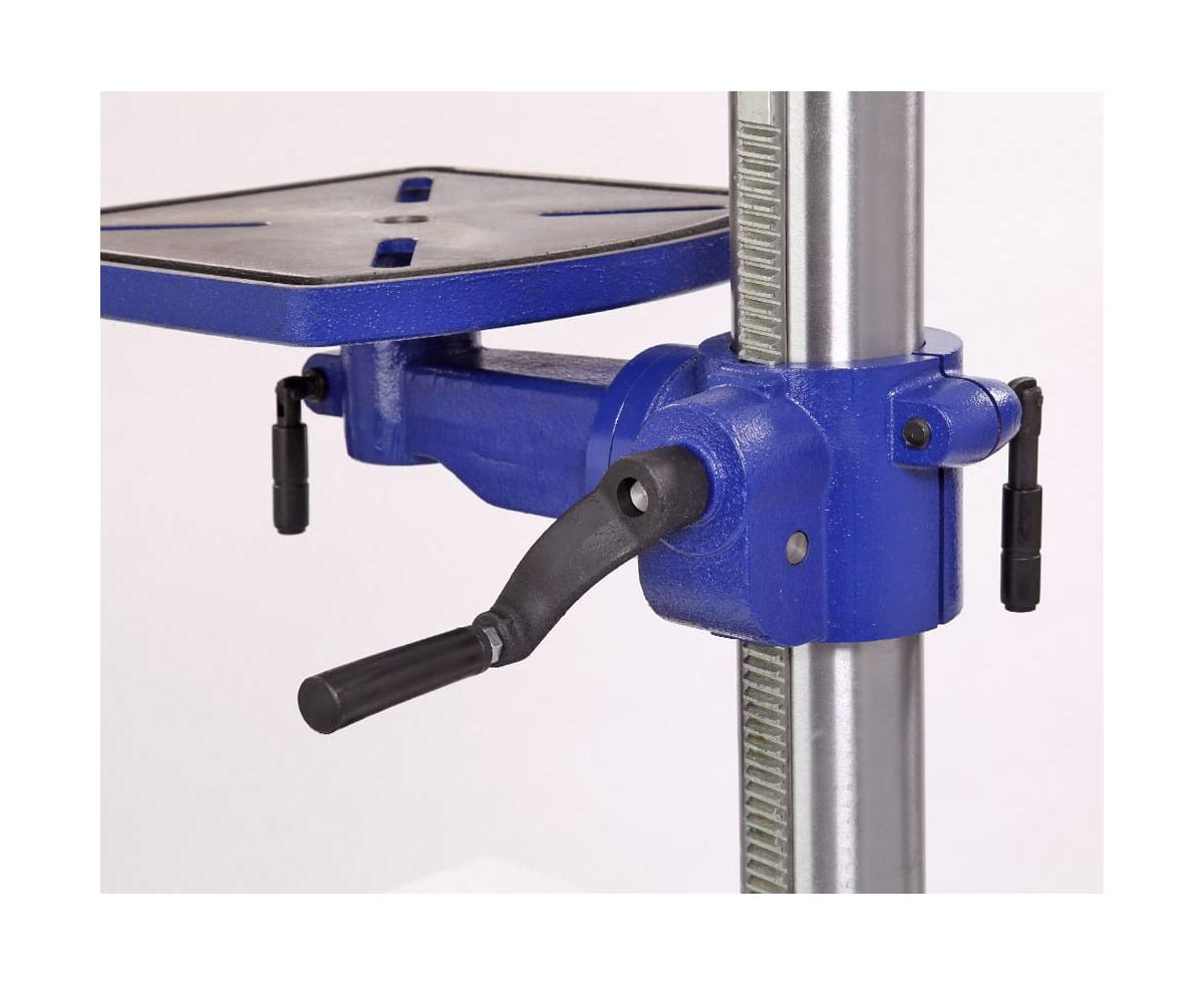 На стойке размещена зубчатая рейка, положение стола регулируется с помощью рукоятки. В опоре есть четыре монтажных отверстия для установки на верстак. Тиски (в комплекте) крепятся через специальные пазы на рабочем столе (4 шт.) и основании (2 шт.).