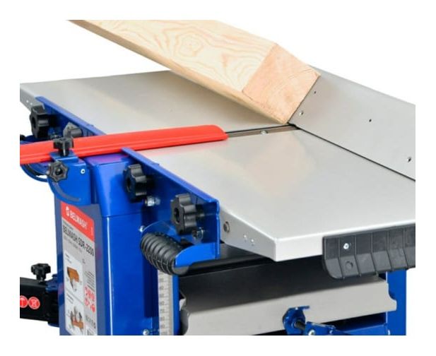 Однофазный двигатель обеспечивает высокую производительность станка. В конструкции предусмотрен патрубок для отвода пыли для поддержания чистоты рабочей зоны. Размер рейсмусового стола составляет 425х260 мм, что позволяет работать с габаритными заготовками.