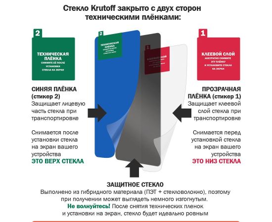 Сохранив гибкость защитной пленки, гибридное стекло намного удобнее обычного закаленного стекла - как при транспортировке, так и при установке. Оно тоньше, прочнее и надежно защищает экран от повреждений. Стекло антишпион не только защитит телефон от механических повреждений, но и скроет экран вашего смартфона от любопытных взглядов. Благодаря специальному свойству, изображение на экране видно только под прямым углом. Со стороны экран будет выглядеть как при выключенном дисплее. Стекло имеет отступы по 1 мм от края дисплея для удобства ношения защитного чехла. Имеет высокую степень устойчивости к царапинам, обеспечивает хорошую чувствительность к касанию и не влияет на сенсорный отклик по всей поверхности дисплея. Гибридное стекло идеально прозрачное, не снижает четкость и яркость изображения, не меняет оригинальную цветопередачу экрана. Изготовлено из гибкого композиционного материала (стекловолокно и ПЭТ). Является гибким и не растрескивается, а края не крошатся, как у обычного закаленного стекла. Защищает от пыли, грязи, брызг и царапин. Верхний слой из стекловолокна по тактильным ощущениям близок к стеклу и не влияет на работу сенсора по всей поверхности экрана. Полная проклейка поверхности (Full Glue). Специальная смесь высококачественных клеев гарантирует установку без пузырьков воздуха и что стекло не отслоится с течением времени. Внимание! Гибридное стекло поставляется в двух защитных транспортировочных пленках (на тыльной и лицевой стороне). Данные пленки могут быть поцарапаны. После наклеивания стекла снимите защитную синюю пленку "2" с лицевой стороны!