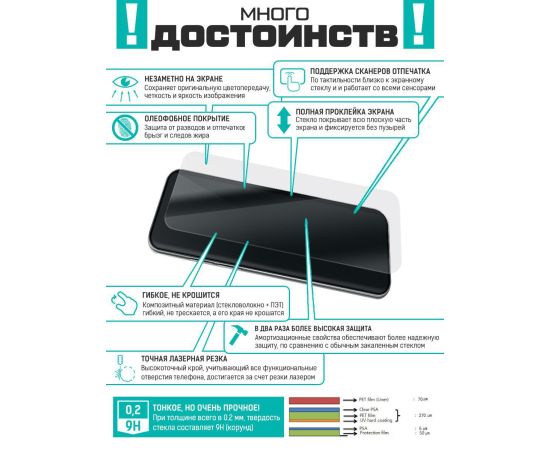 ГИБРИДНОЕ защитное стекло для Вашего смартфона сохраняет гибкость защитной пленки, и прочность стекла. Оно намного удобнее обычного закаленного стекла - как при транспортировке, так и при установке. Гибридное стекло тоньше, прочнее и надежно защищает смартфон от повреждений. Имеет отступы по 1 мм от края дисплея для удобства ношения защитного чехла. Оно имеет высокую степень устойчивости к царапинам, обеспечивает хорошую чувствительность к касанию и не влияет на сенсорный отклик по всей поверхности дисплея. Идеально прозрачное, не снижает четкость и яркость изображения, не меняет оригинальную цветопередачу. Изготовлено из гибкого композиционного материала (стекловолокно и ПЭТ). Верхний слой из стекловолокна по тактильным ощущениям близок к стеклу и не влияет на работу сенсора по всей поверхности экрана. Гибридное стекло гибкое, оно не растрескивается и не крошится, как обычное закаленное стекло. Защищает от пыли, грязи, брызг и царапин. Полная проклейка поверхности (Full Glue). Специальная смесь высококачественных клеев гарантирует установку без пузырьков воздуха и что стекло не отслоится с течением времени. Внимание! Гибридное стекло поставляется в двух защитных транспортировочных пленках (на тыльной и лицевой стороне). Данные пленки могут быть поцарапаны. После наклеивания стекла снимите защитную синюю пленку "2" с лицевой стороны!