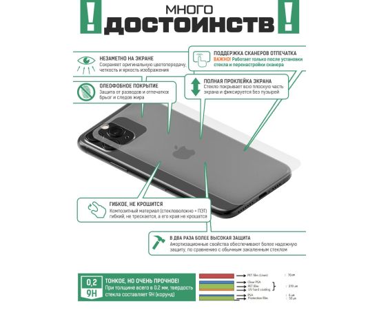 ГИБРИДНОЕ защитное стекло для камеры телефона сохраняет гибкость защитной пленки, и прочность стекла. Оно намного удобнее обычного закаленного стекла - как при транспортировке, так и при установке. Гибридное стекло тоньше, прочнее и надежно защищает смартфон от повреждений. Имеет высокую степень устойчивости к царапинам. Идеально прозрачное, не снижает четкость и яркость изображения, не меняет оригинальную цветопередачу. Изготовлено из гибкого композиционного материала (стекловолокно и ПЭТ). Гибридное стекло гибкое, оно не растрескивается и не крошится, как обычное закаленное стекло. Защищает от пыли, грязи, брызг и царапин. Полная проклейка поверхности (Full Glue). Специальная смесь высококачественных клеев гарантирует установку без пузырьков воздуха и что стекло не отслоится с течением времени. Внимание! Гибридное стекло поставляется в двух защитных транспортировочных пленках (на тыльной и лицевой стороне). Данные пленки могут быть поцарапаны. После наклеивания стекла снимите защитную синюю пленку "2" с лицевой стороны!