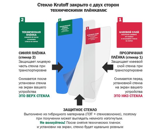 ГИБРИДНОЕ защитное стекло для Вашего смартфона сохраняет гибкость защитной пленки, и прочность стекла. Оно намного удобнее обычного закаленного стекла - как при транспортировке, так и при установке. Гибридное стекло тоньше, прочнее и надежно защищает смартфон от повреждений. Имеет отступы по 1 мм от края дисплея для удобства ношения защитного чехла. Оно имеет высокую степень устойчивости к царапинам, обеспечивает хорошую чувствительность к касанию и не влияет на сенсорный отклик по всей поверхности дисплея. Идеально прозрачное, не снижает четкость и яркость изображения, не меняет оригинальную цветопередачу. Изготовлено из гибкого композиционного материала (стекловолокно и ПЭТ). Верхний слой из стекловолокна по тактильным ощущениям близок к стеклу и не влияет на работу сенсора по всей поверхности экрана. Гибридное стекло гибкое, оно не растрескивается и не крошится, как обычное закаленное стекло. Защищает от пыли, грязи, брызг и царапин. Полная проклейка поверхности (Full Glue). Специальная смесь высококачественных клеев гарантирует установку без пузырьков воздуха и что стекло не отслоится с течением времени. Обращаем Ваше внимание, что при использовании гибридного стекла с функцией "антишпион" сканер отпечатка пальца не работает! Внимание! Гибридное стекло поставляется в двух защитных транспортировочных пленках (на тыльной и лицевой стороне). Данные пленки могут быть поцарапаны. После наклеивания стекла снимите защитную синюю пленку "2" с лицевой стороны!