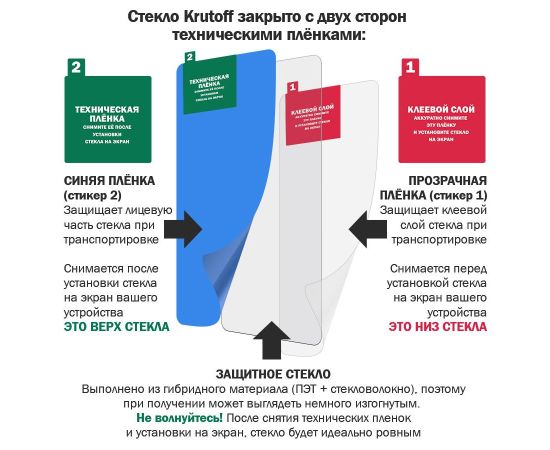 ГИБРИДНОЕ защитное стекло для экрана и камеры телефона сохраняет гибкость защитной пленки, и прочность стекла. Оно намного удобнее обычного закаленного стекла - как при транспортировке, так и при установке. Гибридное стекло тоньше, прочнее и надежно защищает смартфон от повреждений. Имеет отступы по 1 мм от края дисплея для удобства ношения защитного чехла. Оно имеет высокую степень устойчивости к царапинам, обеспечивает хорошую чувствительность к касанию и не влияет на сенсорный отклик по всей поверхности дисплея. Идеально прозрачное, не снижает четкость и яркость изображения, не меняет оригинальную цветопередачу. Изготовлено из гибкого композиционного материала (стекловолокно и ПЭТ). Верхний слой из стекловолокна по тактильным ощущениям близок к стеклу и не влияет на работу сенсора по всей поверхности экрана. Гибридное стекло гибкое, оно не растрескивается и не крошится, как обычное закаленное стекло. Защищает от пыли, грязи, брызг и царапин. Полная проклейка поверхности (Full Glue). Специальная смесь высококачественных клеев гарантирует установку без пузырьков воздуха и что стекло не отслоится с течением времени. Внимание! Гибридное стекло поставляется в двух защитных транспортировочных пленках (на тыльной и лицевой стороне). Данные пленки могут быть поцарапаны. После наклеивания стекла снимите защитную синюю пленку "2" с лицевой стороны!