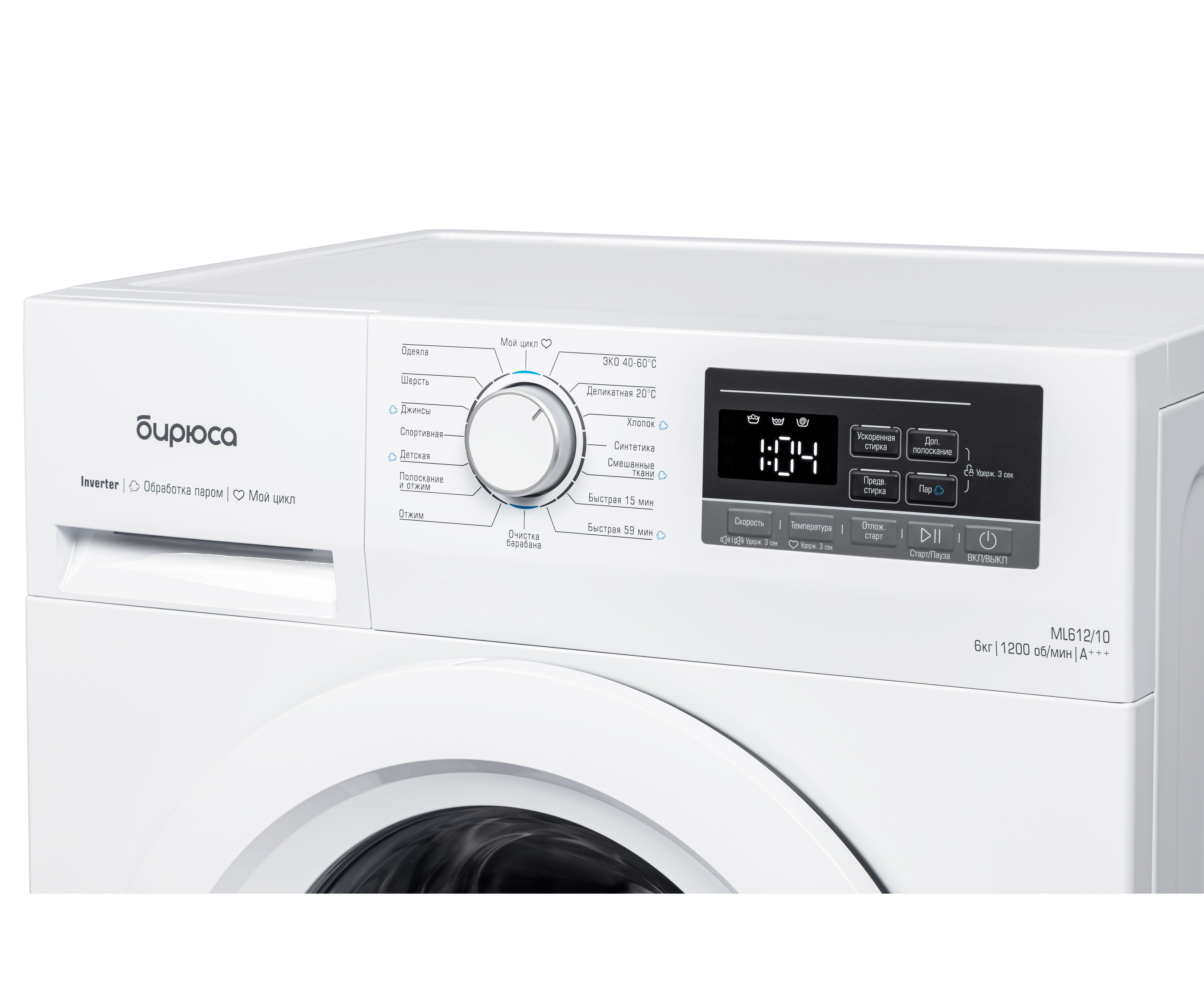 Дополнительные функции Выбор скорости отжима, Выбор температуры, Обработка паром, Предварительная стирка, Дополнительное полоскание, Блокировка от детей, Ускоренная стирка, Отложенный старт, Отключение звукового сигнала
