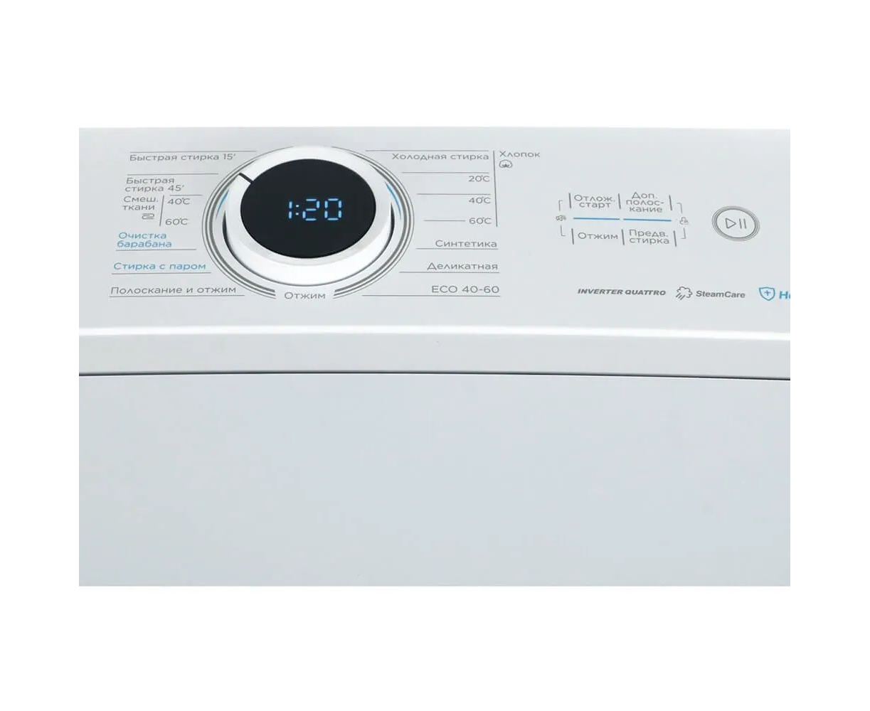 - Программы: хлопок холодная, хлопок 20 °С, хлопок 40 °С, хлопок 60 °С, синтетика, деликатная, Eco 40-60, быстрая стирка 15 мин, быстрая стирка 45 мин, смешанные ткани 40 °С, смешанные ткани 60 °С, стирка с паром, полоскание и отжим, отжим