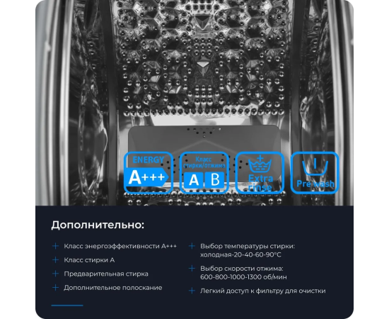 Программы стирки: Быстрая стирка, Отжим, Полоскание + отжим, Стирка детской одежды, Стирка изделий из джинсовой ткани, Стирка изделий из синтетики, Стирка изделий из шерсти, Стирка изделий из хлопка, Стирка смешанных тканей, Стирка спортивной одежды, Экономичная стирка, Цветное белье, Ежедневная стирка
