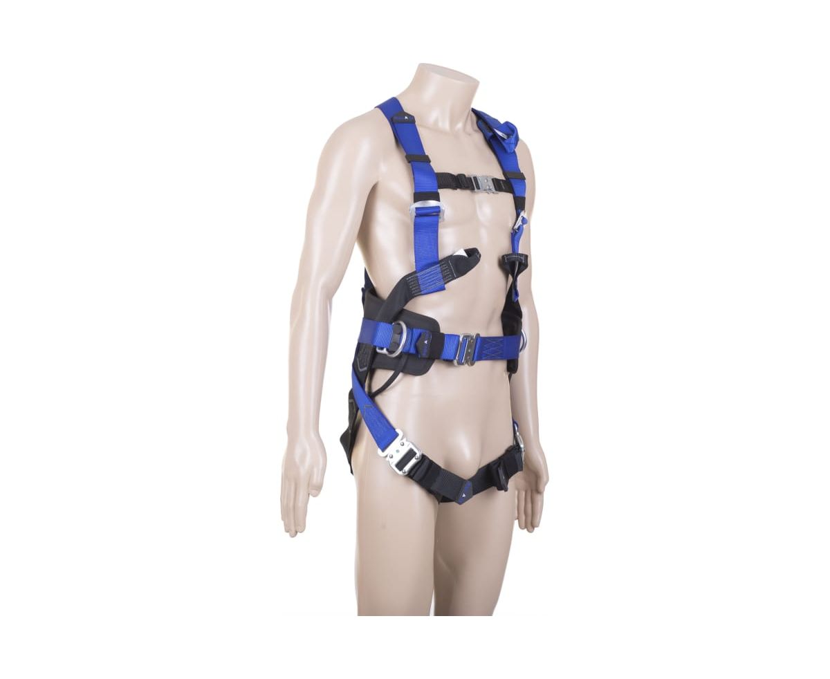 Автоматические пряжки КЛИК позволяют быстро одеть привязь. Для идентификации верха и низа привязи лямки имеют разные цвета (синий, черный). X-образная пластина на спине, предотвращающая наплечные лямки от сдвига и удушения пользователя в случае срыва.