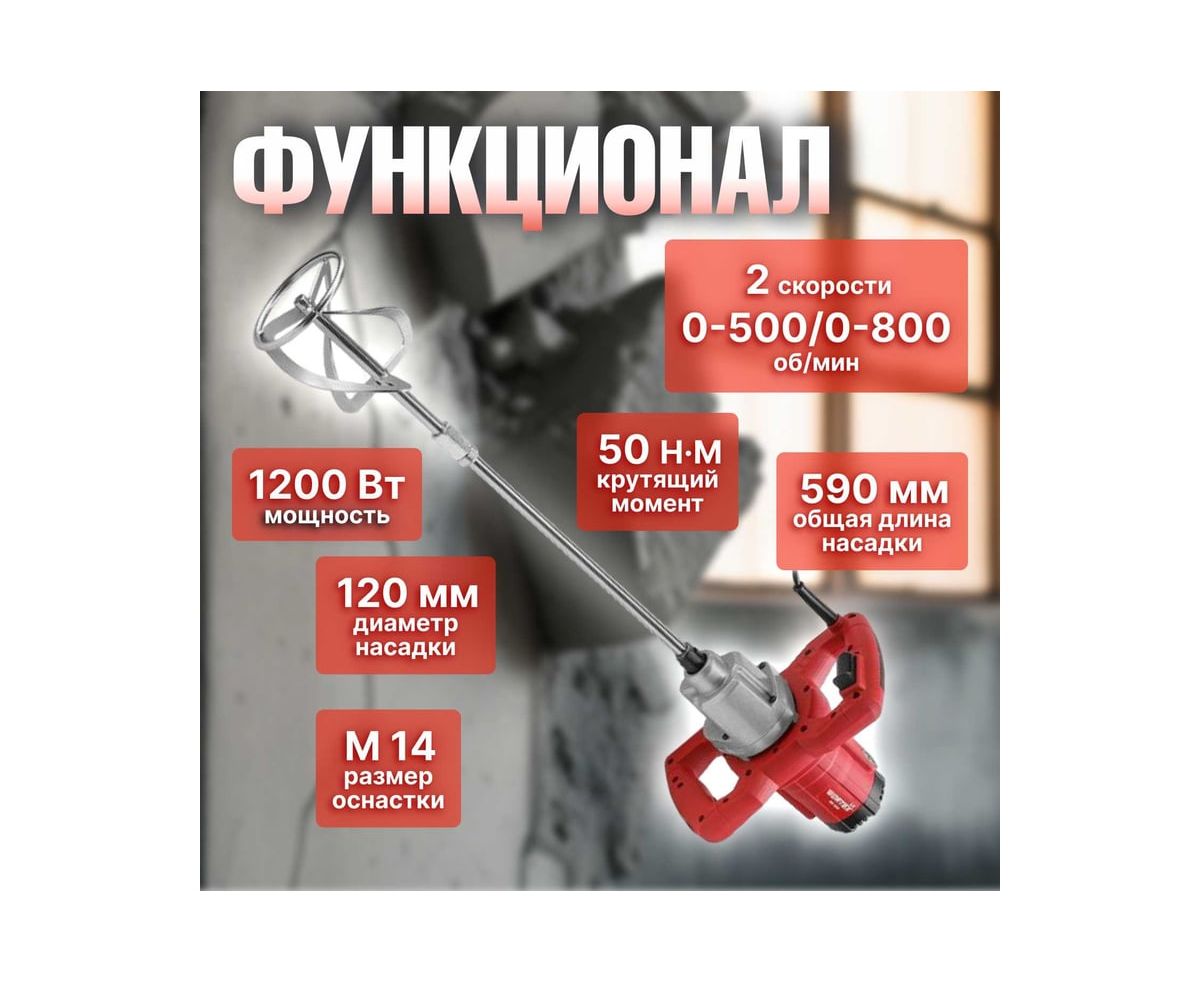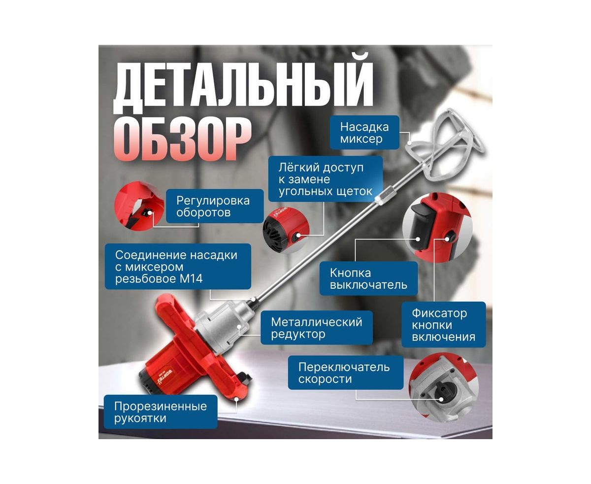 Миксер WORTEX подходит для размешивания красок, лаков, клеев и строительных растворов. Модель обладает двухскоростным редуктором для лучшей производительности, а также регулировкой скорости.