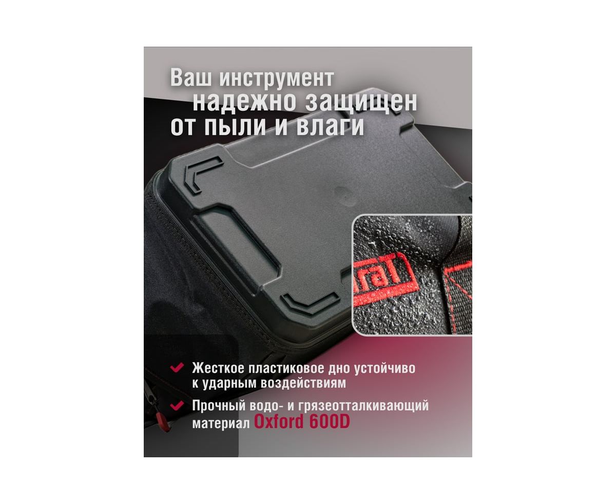 Дно сумки выполнено из прочного морозостойкого пластика с высокими бортиками, что гарантирует надежную защиту вашего инструмента от влаги, грязи, износа и ударных воздействий.