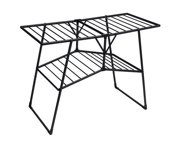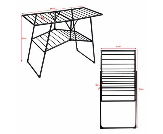 Размер – 61х131х12 см в сложенном виде и 61х130х95 см с разложенными полками. Выдерживает нагрузку до 50 кг. Устойчивая, вместительная и компактная в хранении, при необходимости быстро и легко складывается и убирается. Заменяет до 22 метров бельевой веревки!