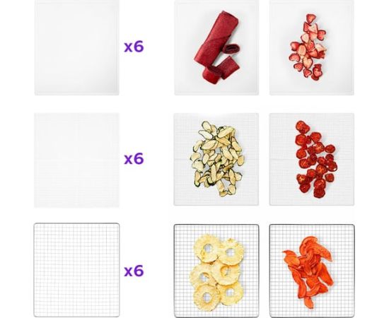 В комплекте к сушилке идут 6 металлических поддонов, 6 сеток для мелких продуктов и 6 сплошных пластиковых поддонов.